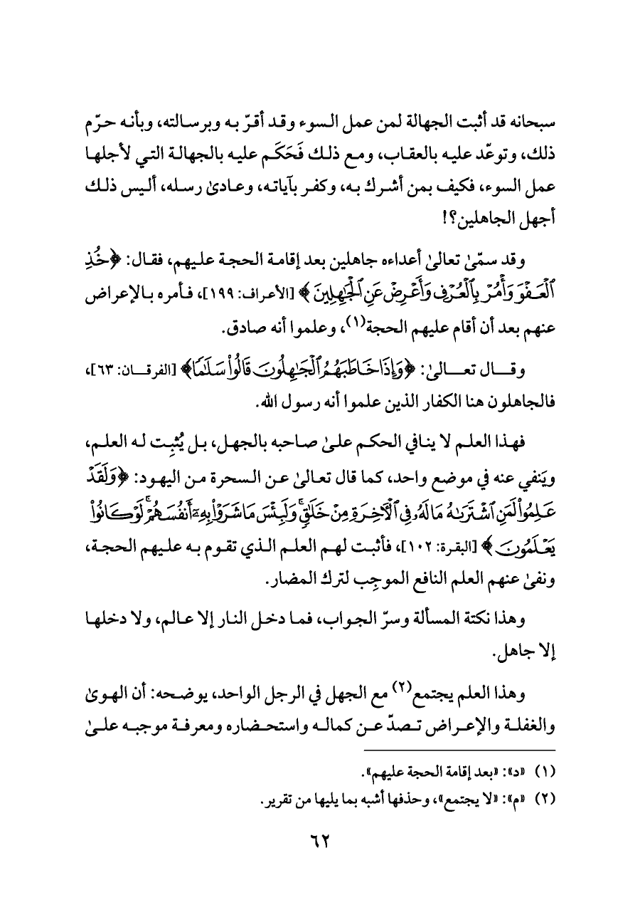 فهذا العلم لا ينافي الحكم على صاحبه بالجهل، بل يُثبِت له العلم، ويَنفي عنه في موضع واحد، كما قال تعالى عن السحرة من اليهود: {وَلَقَدْ عَلِمُوا لَمَنِ اشْتَرَاهُ مَا لَهُ فِي الْآخِرَةِ مِنْ خَلَاقٍ وَلَبِئْسَ مَا شَرَوْا بِهِ أَنْفُسَهُمْ لَوْ كَانُوا يَعْلَمُونَ} [البقرة: ١٠٢]، فأثبت لهم العلم الذي تقوم به عليهم الحجة، ونفى عنهم العلم النافع الموجِب لترك المضار.