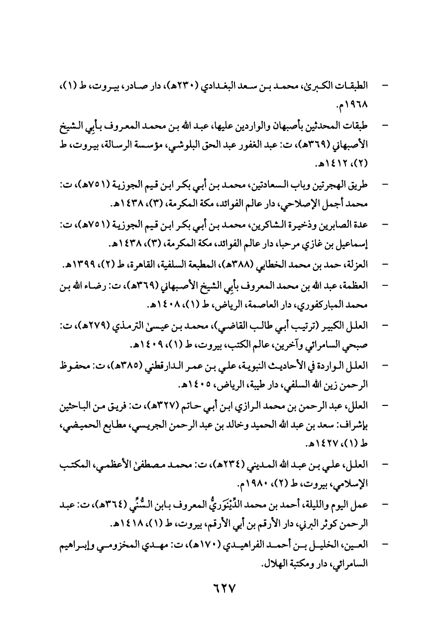 - العلل، عبد الرحمن بن محمد الرازي ابن أبي حاتم (٣٢٧ هـ)، ت: فريق من الباحثين بإشراف: سعد بن عبد الله الحميد وخالد بن عبد الرحمن الجريسي، مطابع الحميضي، ط (١)، ١٤٢٧ هـ.