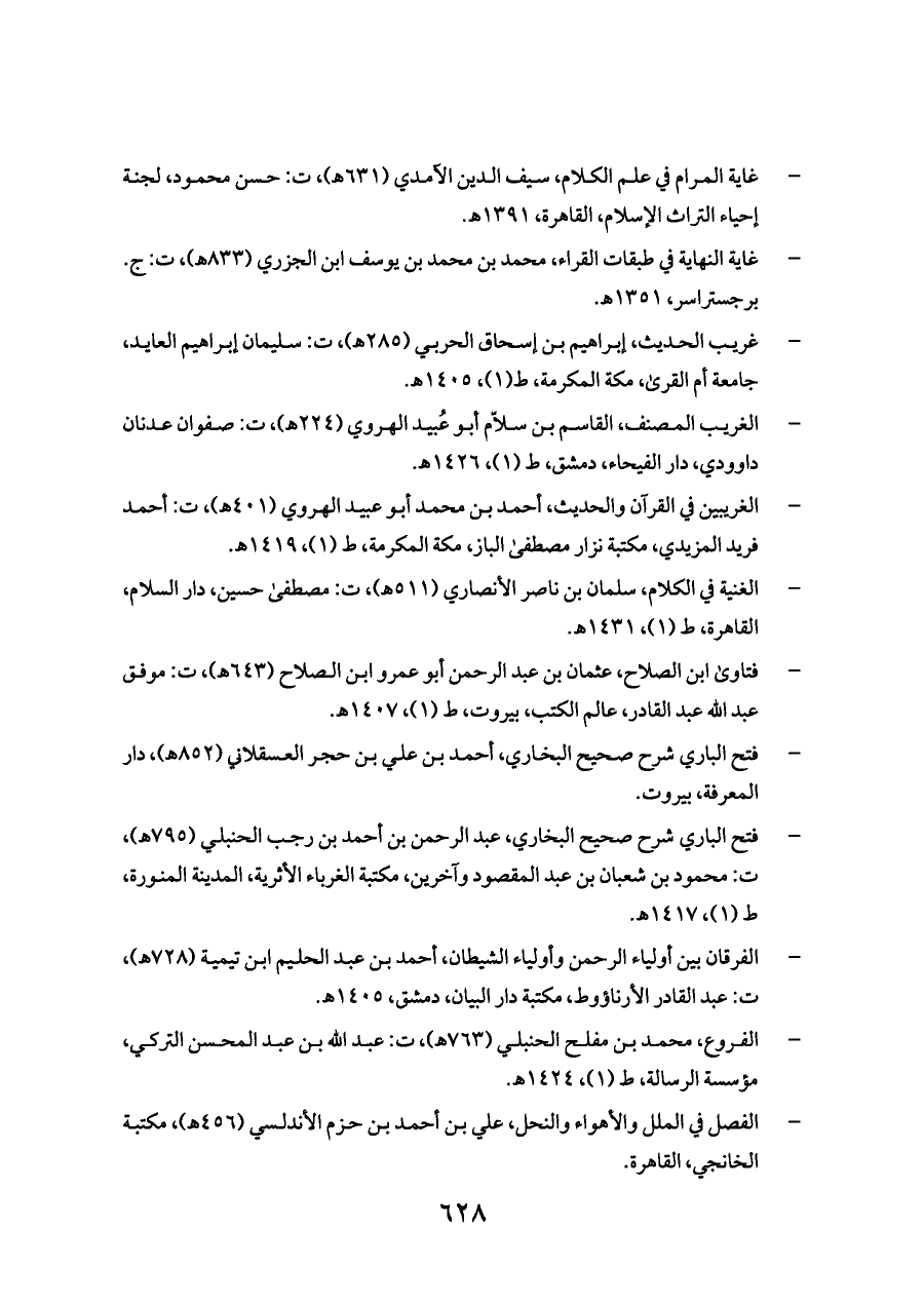 - الفروع، محمد بن مفلح الحنبلي (٧٦٣ هـ)، ت: عبد الله بن عبد المحسن التركي، مؤسسة الرسالة، ط (١)، ١٤٢٤ هـ.