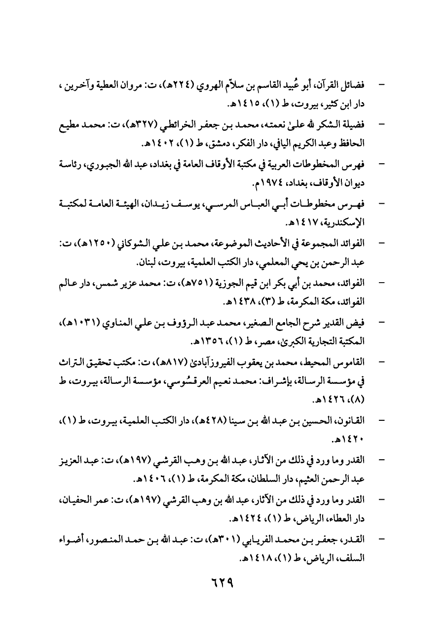 - القدر وما ورد في ذلك من الآثار، عبد الله بن وهب القرشي (١٩٧ هـ)، ت: عبد العزيز عبد الرحمن العثيم، دار السلطان، مكة المكرمة، ط (١)، ١٤٠٦ هـ.
