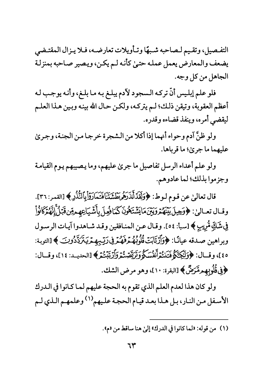 ولو كان هذا لعدم العلم الذي تقوم به الحجة عليهم لما كانوا في الدرك الأسفل من النار، بل هذا بعد قيام الحجة عليهم (¬١) وعلمهم الذي لم