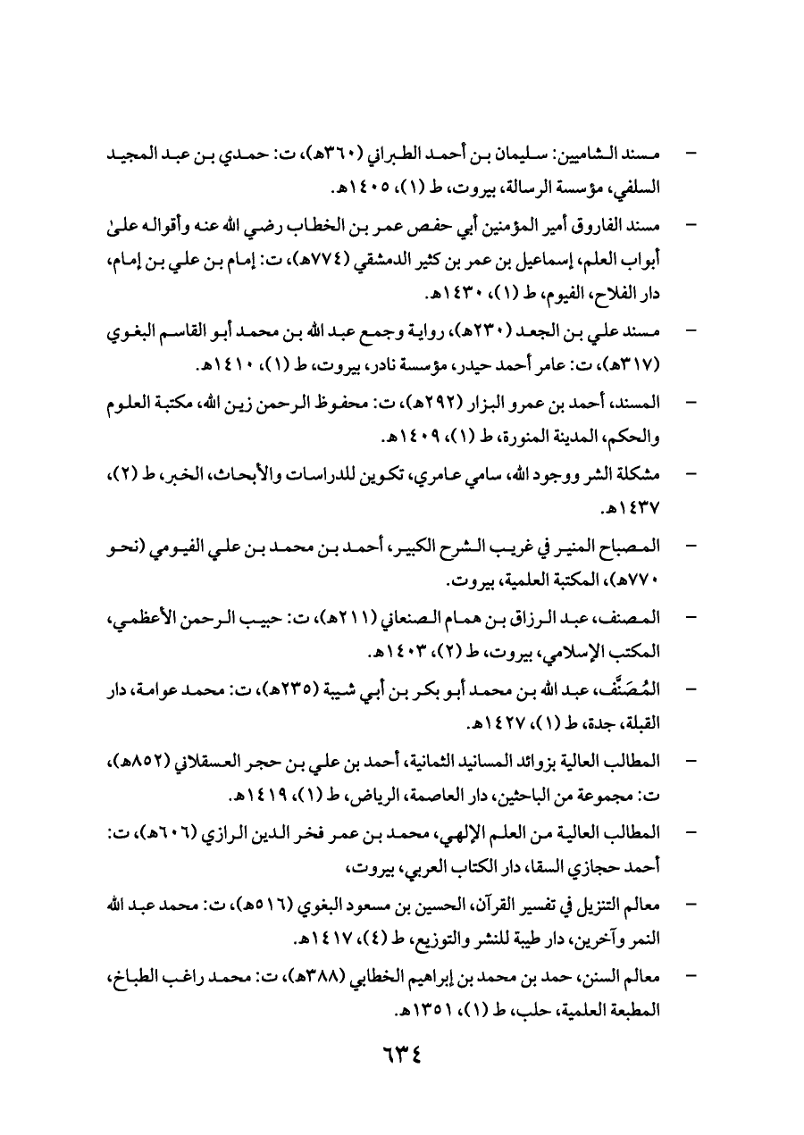 - مسند الفاروق أمير المؤمنين أبي حفص عمر بن الخطاب رضي الله عنه وأقواله على أبواب العلم، إسماعيل بن عمر بن كثير الدمشقي (٧٧٤ هـ)، ت: إمام بن علي بن إمام، دار الفلاح، الفيوم، ط (١)، ١٤٣٠ هـ.