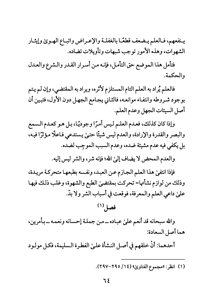 فالعلم يُراد به العلم التام المستلزم لأثره، ويراد به المقتضي، وإن لم يتم بوجود شروطه وانتفاء موانعه، فالثاني يجامع الجهل دون الأول، فتبين أن أصل السيئات الجهل وعدم العلم.