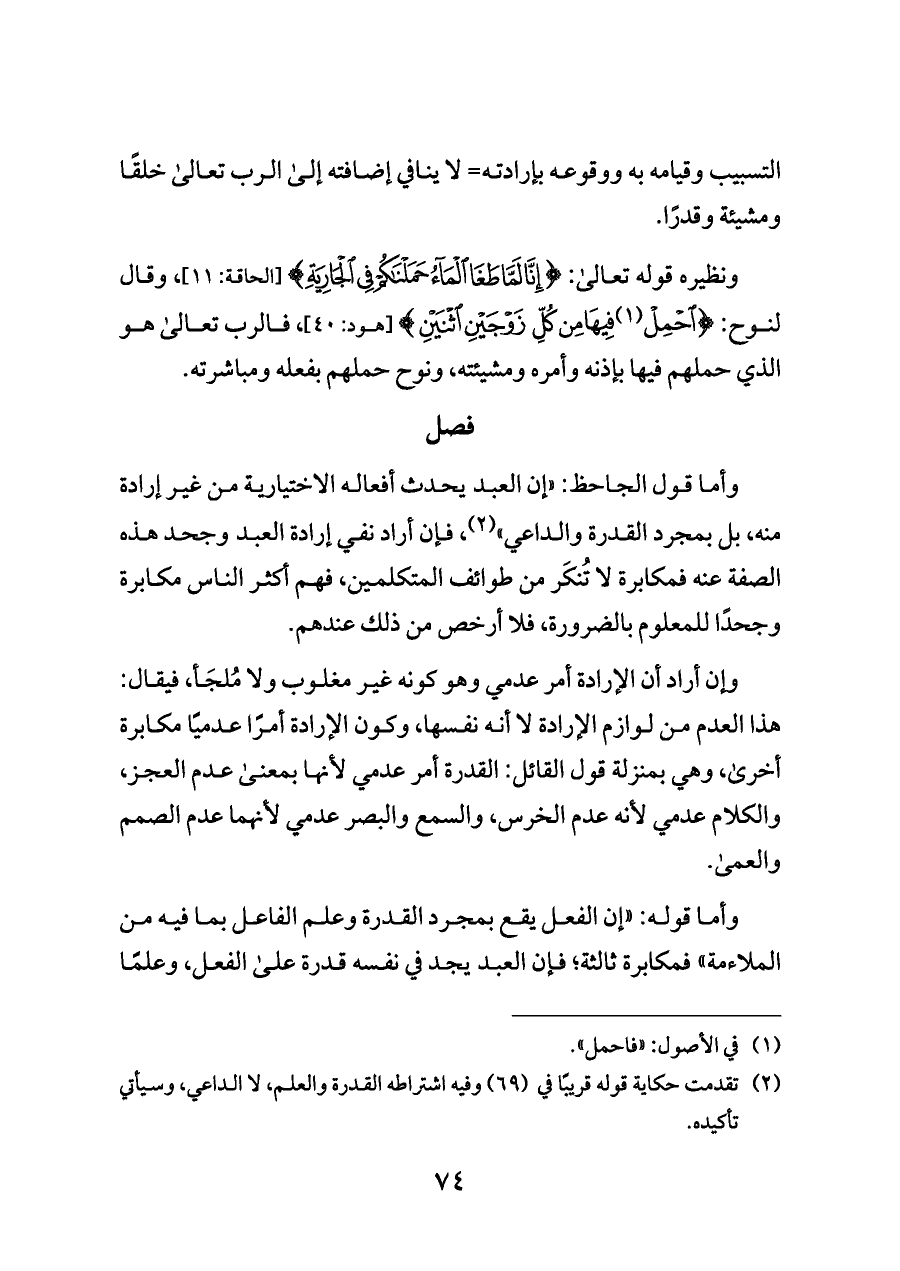 وأما قول الجاحظ: «إن العبد يحدث أفعاله الاختيارية من غير إرادة منه، بل بمجرد القدرة والداعي» (¬٢)، فإن أراد نفي إرادة العبد وجحد هذه الصفة عنه فمكابرة لا تُنكَر من طوائف المتكلمين، فهم أكثر الناس مكابرة وجحدًا للمعلوم بالضرورة، فلا أرخص من ذلك عندهم.