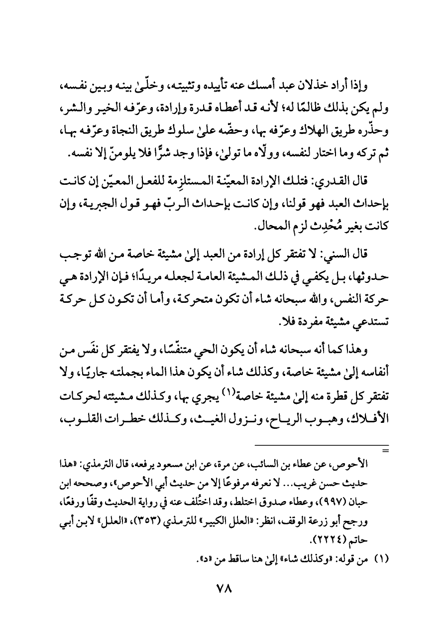 قال السني: لا تفتقر كل إرادة من العبد إلى مشيئة خاصة من الله توجب حدوثها، بل يكفي في ذلك المشيئة العامة لجعله مريدًا؛ فإن الإرادة هي حركة النفس، والله سبحانه شاء أن تكون متحركة، وأما أن تكون كل حركة تستدعي مشيئة مفردة فلا.