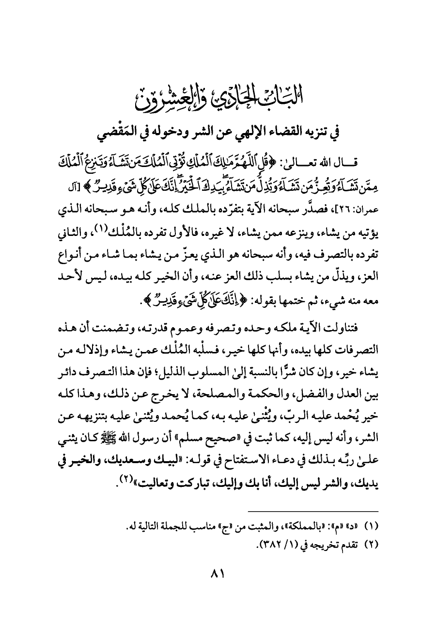 فتناولت الآية ملكه وحده وتصرفه وعموم قدرته، وتضمنت أن هذه التصرفات كلها بيده، وأنها كلها خير، فسلْبه المُلْك عمن يشاء وإذلاله من يشاء خير، وإن كان شرًّا بالنسبة إلى المسلوب الذليل؛ فإن هذا التصرف دائر بين العدل والفضل، والحكمة والمصلحة، لا يخرج عن ذلك، وهذا كله خير يُحْمد عليه الربّ، ويُثْنى عليه به، كما يُحمد ويُثنى عليه بتنزيهه عن الشر، وأنه ليس إليه، كما ثبت في «صحيح مسلم» أن رسول الله - صلى الله عليه وسلم - كان يثني على ربِّه بذلك في دعاء الاستفتاح في قوله: «لبيك وسعديك، والخير في يديك، والشر ليس إليك، أنا بك وإليك، تباركت وتعاليت» (¬٢).