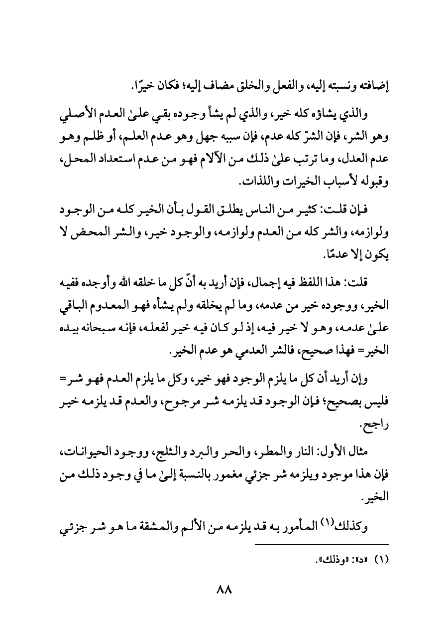 فإن قلت: كثير من الناس يطلق القول بأن الخير كله من الوجود ولوازمه، والشر كله من العدم ولوازمه، والوجود خير، والشر المحض لا يكون إلا عدمًا.