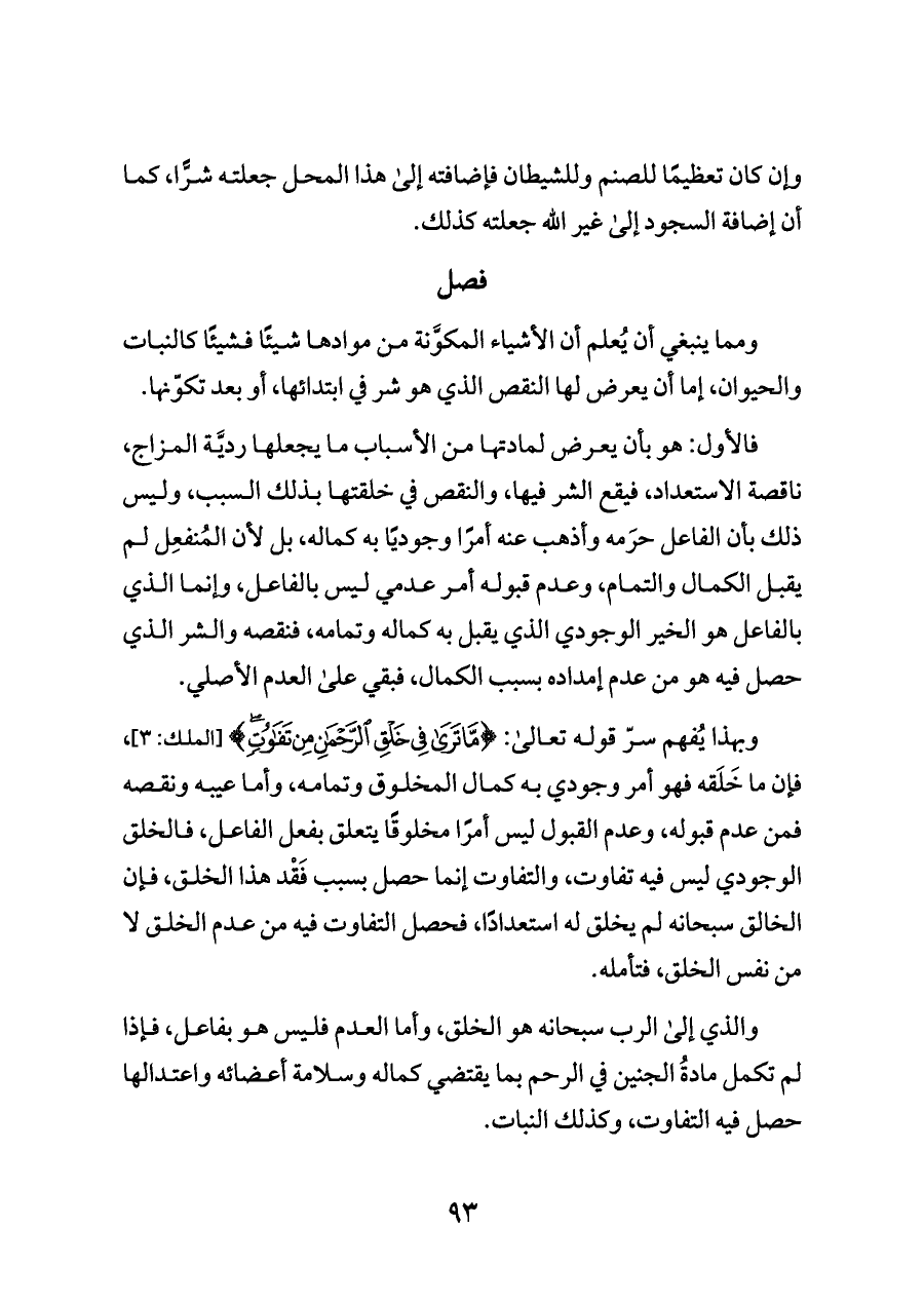وبهذا يُفهم سرّ قوله تعالى: {مَا تَرَى فِي خَلْقِ الرَّحْمَنِ مِنْ تَفَاوُتٍ} [الملك: ٣]، فإن ما خَلَقه فهو أمر وجودي به كمال المخلوق وتمامه، وأما عيبه ونقصه فمن عدم قبوله، وعدم القبول ليس أمرًا مخلوقًا يتعلق بفعل الفاعل، فالخلق الوجودي ليس فيه تفاوت، والتفاوت إنما حصل بسبب فَقْد هذا الخلق، فإن الخالق سبحانه لم يخلق له استعدادًا، فحصل التفاوت فيه من عدم الخلق لا من نفس الخلق، فتأمله.