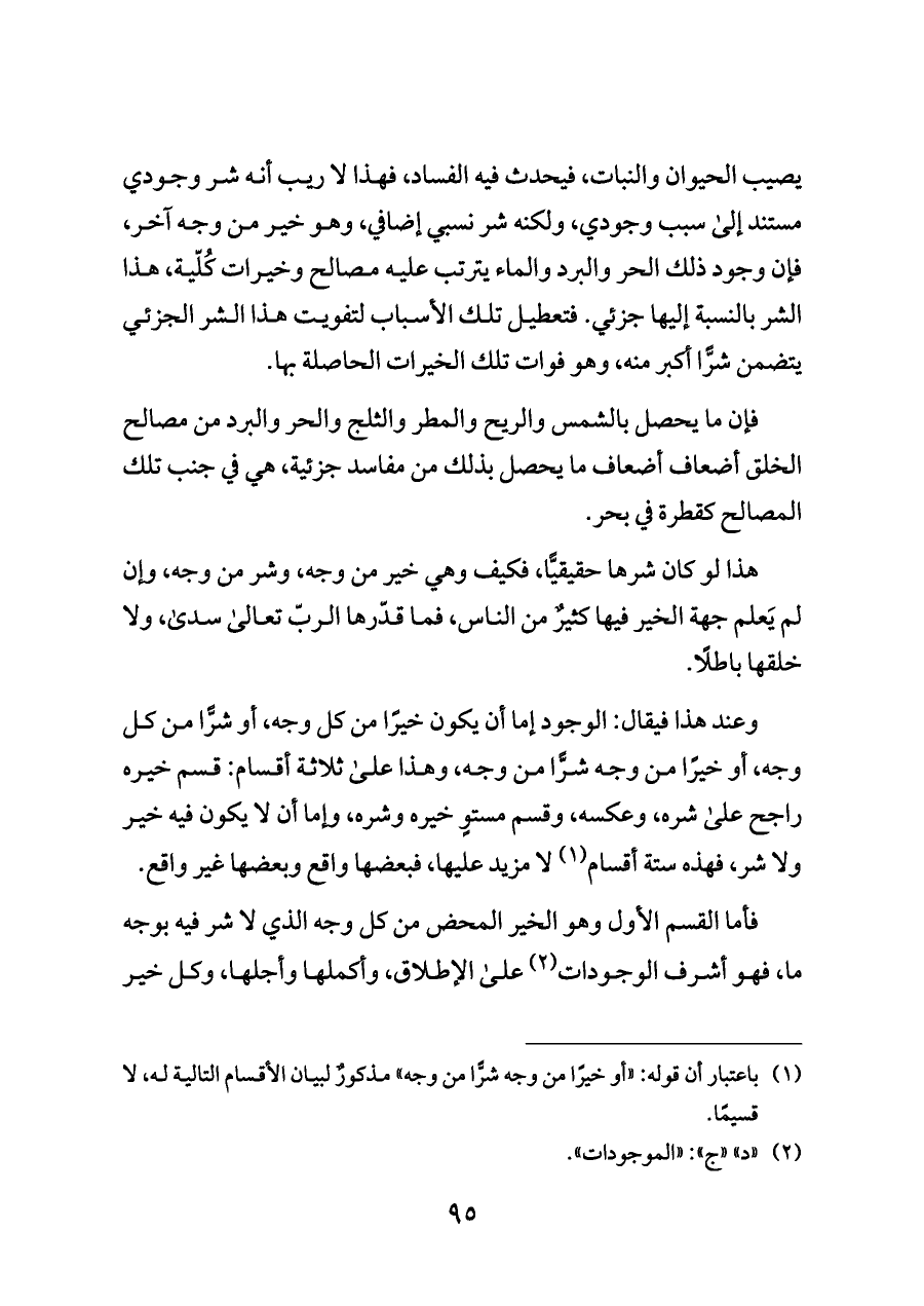 يصيب الحيوان والنبات، فيحدث فيه الفساد، فهذا لا ريب أنه شر وجودي مستند إلى سبب وجودي، ولكنه شر نسبي إضافي، وهو خير من وجه آخر، فإن وجود ذلك الحر والبرد والماء يترتب عليه مصالح وخيرات كُلّية، هذا الشر بالنسبة إليها جزئي. فتعطيل تلك الأسباب لتفويت هذا الشر الجزئي يتضمن شرًّا أكبر منه، وهو فوات تلك الخيرات الحاصلة بها.