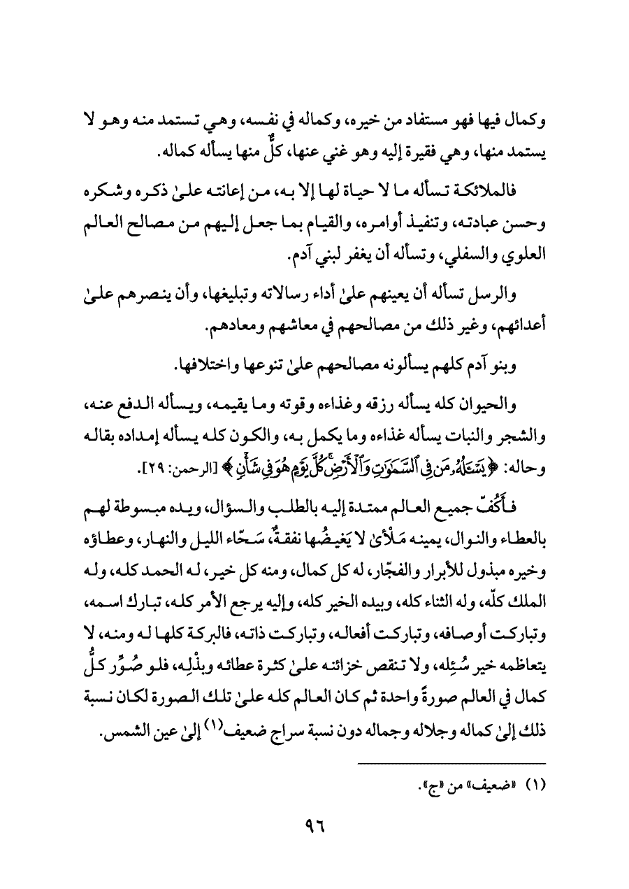 فأَكُفّ جميع العالم ممتدة إليه بالطلب والسؤال، ويده مبسوطة لهم بالعطاء والنوال، يمينه مَلْأى لا يَغيضُها نفقةٌ، سَحّاء الليل والنهار، وعطاؤه وخيره مبذول للأبرار والفجّار، له كل كمال، ومنه كل خير، له الحمد كله، وله الملك كلّه، وله الثناء كله، وبيده الخير كله، وإليه يرجع الأمر كله، تبارك اسمه، وتباركت أوصافه، وتباركت أفعاله، وتباركت ذاته، فالبركة كلها له ومنه، لا يتعاظمه خير سُئِله، ولا تنقص خزائنه على كثرة عطائه وبذْلِه، فلو صُوِّر كلُّ كمال في العالم صورةً واحدة ثم كان العالم كله على تلك الصورة لكان نسبة ذلك إلى كماله وجلاله وجماله دون نسبة سراج ضعيف (¬١) إلى عين الشمس.