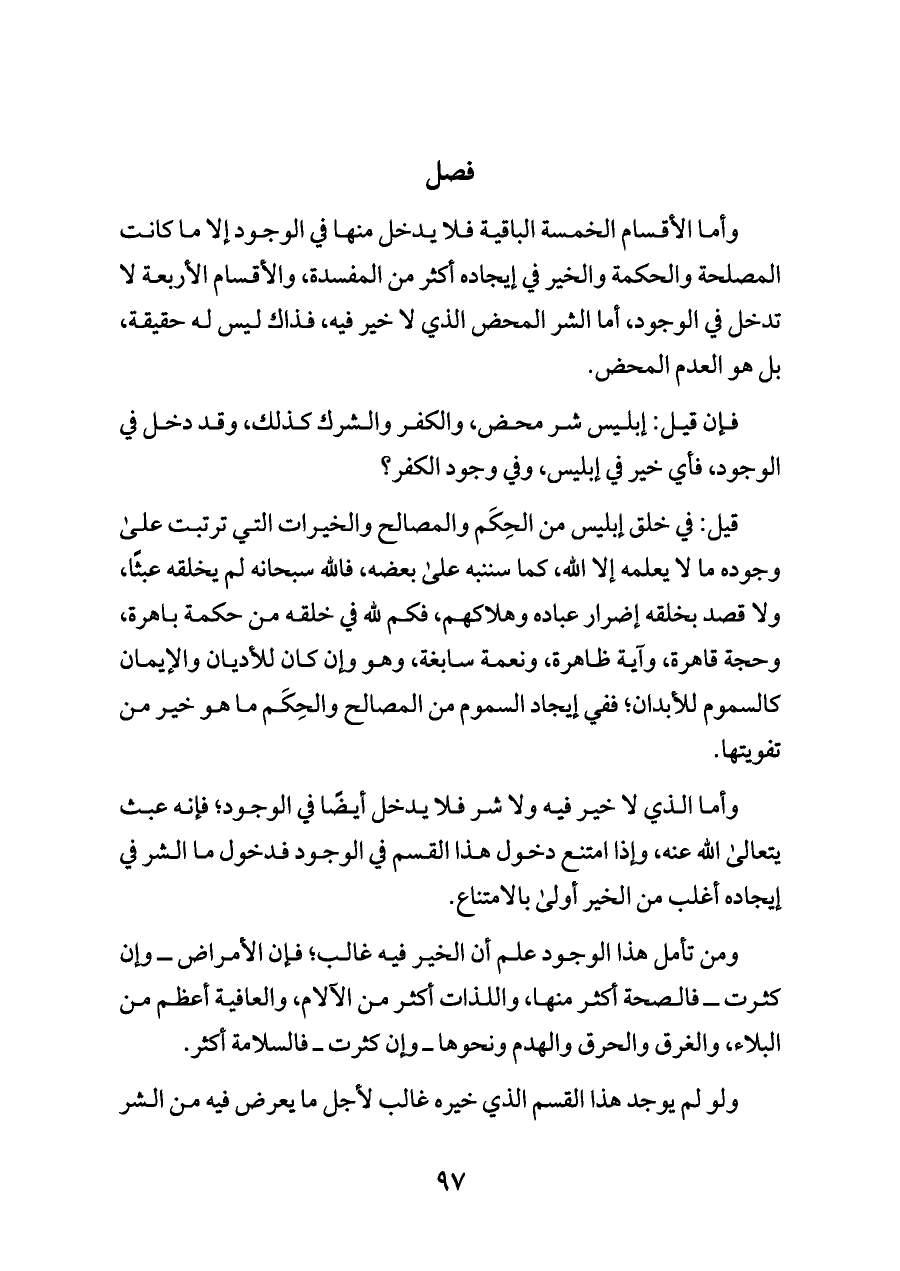 وأما الذي لا خير فيه ولا شر فلا يدخل أيضًا في الوجود؛ فإنه عبث يتعالى الله عنه، وإذا امتنع دخول هذا القسم في الوجود فدخول ما الشر في إيجاده أغلب من الخير أولى بالامتناع.