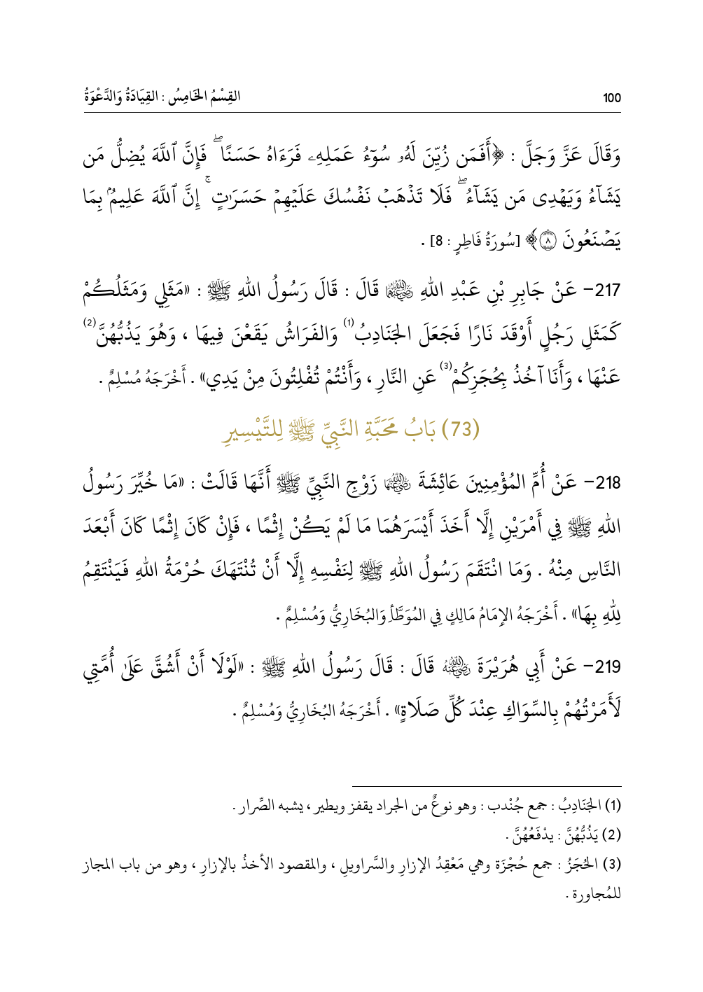 ٢١٧ - عَنْ جَابِرِ بْنِ عَبْدِ اللهِ - رضي الله عنهما - قَالَ: قَالَ رَسُولُ اللهِ - صلى الله عليه وسلم -: «مَثَلِي وَمَثَلُكُمْ كَمَثَلِ رَجُلٍ أَوْقَدَ نَارًا فَجَعَلَ الجَنَادِبُ (¬١) وَالفَرَاشُ يَقَعْنَ فِيهَا، وَهُوَ يَذُبُّهُنَّ (¬٢) عَنْهَا، وَأَنَا آخُذُ بِحُجَزِكُمْ (¬٣) عَنِ النَّارِ، وَأَنْتُمْ تُفْلِتُونَ مِنْ يَدِي». أَخْرَجَهُ مُسْلِمٌ.