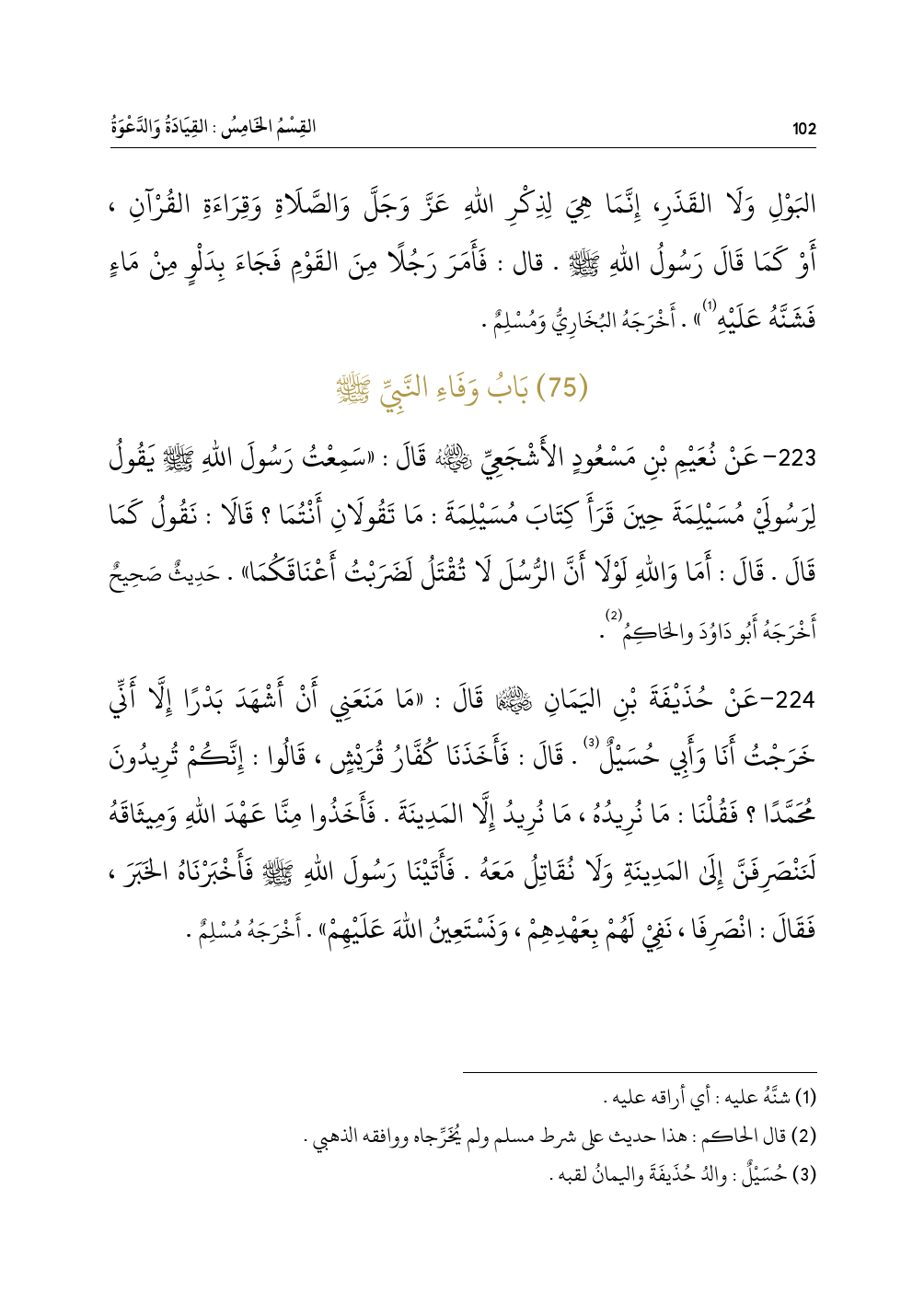 ٢٢٤ - عَنْ حُذَيْفَةَ بْنِ اليَمَانِ - رضي الله عنهما - قَالَ: «مَا مَنَعَنِي أَنْ أَشْهَدَ بَدْرًا إِلَّا أَنِّي خَرَجْتُ أَنَا وَأَبِي حُسَيْلٌ (¬٣). قَالَ: فَأَخَذَنَا كُفَّارُ قُرَيْشٍ، قَالُوا: إِنَّكُمْ تُرِيدُونَ مُحَمَّدًا؟ فَقُلْنَا: مَا نُرِيدُهُ، مَا نُرِيدُ إِلَّا المَدِينَةَ. فَأَخَذُوا مِنَّا عَهْدَ اللهِ وَمِيثَاقَهُ لَنَنْصَرِفَنَّ إِلَى المَدِينَةِ وَلَا نُقَاتِلُ مَعَهُ. فَأَتَيْنَا رَسُولَ اللهِ - صلى الله عليه وسلم - فَأَخْبَرْنَاهُ الخَبَرَ، فَقَالَ: انْصَرِفَا، نَفِيْ لَهُمْ بِعَهْدِهِمْ، وَنَسْتَعِينُ اللهَ عَلَيْهِمْ». أَخْرَجَهُ مُسْلِمٌ.