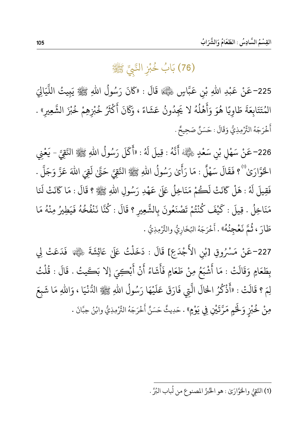 ٢٢٥ - عَنْ عَبْدِ اللهِ بْنِ عَبَّاسٍ - رضي الله عنهما - قَالَ: «كَانَ رَسُولُ اللهِ - صلى الله عليه وسلم - يَبِيتُ اللَّيَالِيَ المُتَتَابِعَةَ طَاوِيًا هُوَ وَأَهْلُهُ لا يَجِدُونُ عَشَاءً، وَكَانَ أَكْثَرُ خُبْزِهِمْ خُبْزَ الشَّعِيرِ». أَخْرَجَهُ التِّرْمِذِيُّ وَقَالَ: حَسَنٌ صَحِيحٌ.