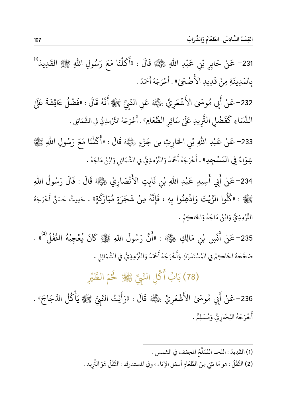 ٢٣٥ - عَنْ أَنَسِ بْنِ مَالِكٍ - رضي الله عنه -: «أَنَّ رَسُولَ اللهِ - صلى الله عليه وسلم - كَانَ يُعْجِبُهُ الثُّفْلُ (¬٢)». صَحَّحَهُ الحَاكِمُ فِي المُسْتَدْرَكِ وَأَخْرَجَهُ أَحْمَدُ وَالتِّرْمِذِيُّ في الشَّمَائِلِ.