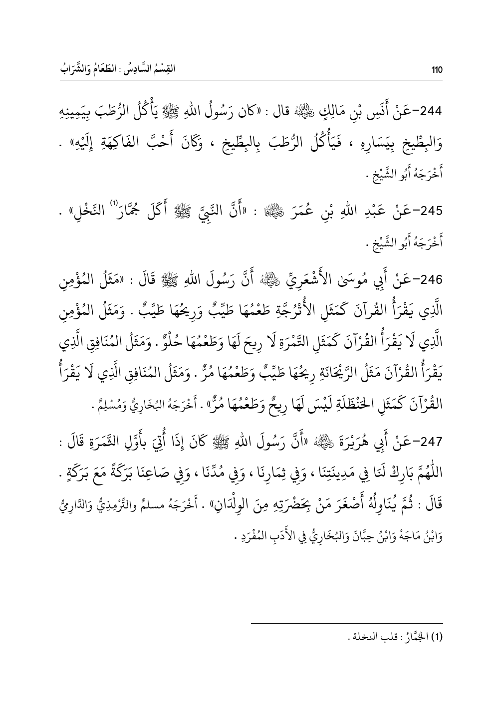 ٢٤٧ - عَنْ أَبِي هُرَيْرَةَ - رضي الله عنه - «أَنَّ رَسُولَ اللهِ - صلى الله عليه وسلم - كَانَ إِذَا أُتِيَ بأَوَّلِ الثَّمَرَةِ قَالَ: اللّاهُمَّ بَارِكْ لَنَا فِي مَدِينَتِنَا، وَفِي ثِمَارِنَا، وَفِي مُدِّنَا، وَفِي صَاعِنَا بَرَكَةً مَعَ بَرَكَةٍ. قَالَ: ثُمَّ يُنَاوِلُهُ أَصْغَرَ مَنْ بِحَضْرَتِهِ مِنَ الوِلْدَانِ». أَخْرَجَهُ مسلمٌ والتِّرْمِذِيُّ وَالدَّارِميُّ وَابْنُ مَاجَهْ وَابْنُ حِبَّانَ وَالبُخَارِيُّ فِي الأَدَبِ المُفْرَدِ.