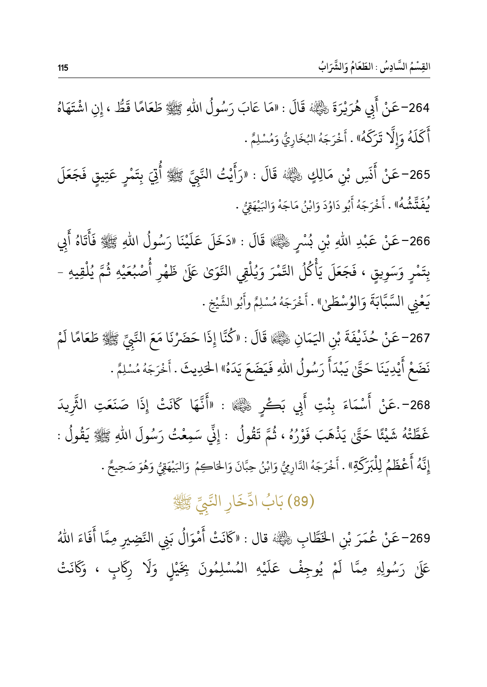 ٢٦٤ - عَنْ أَبِي هُرَيْرَةَ - رضي الله عنه - قَالَ: «مَا عَابَ رَسُولُ اللهِ - صلى الله عليه وسلم - طَعَامًا قَطُّ، إِنِ اشْتَهَاهُ أَكَلَهُ وَإِلَّا تَرَكَهُ». أَخْرَجَهُ البُخَارِيُّ وَمُسْلِمٌ.