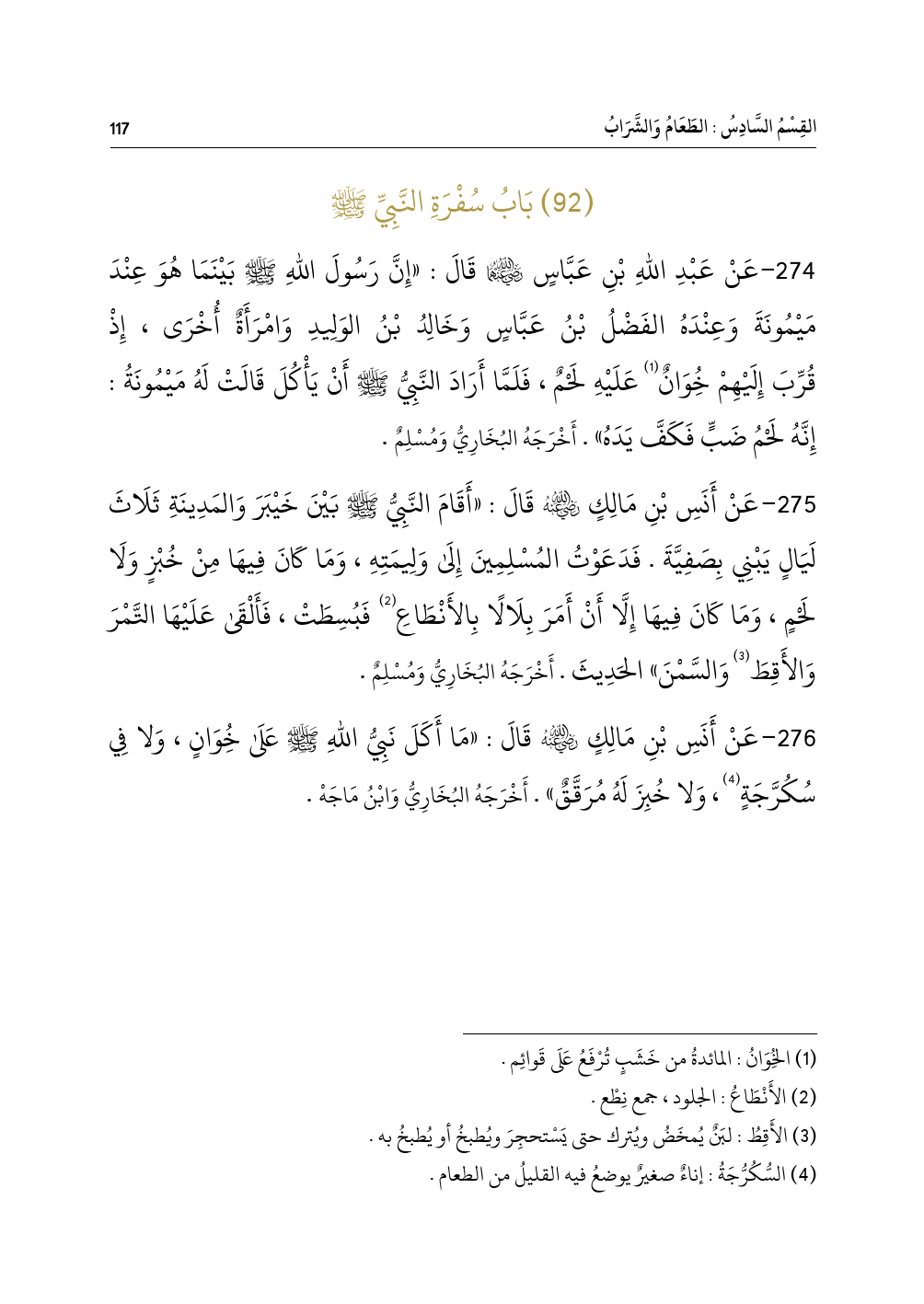 ٢٧٤ - عَنْ عَبْدِ اللهِ بْنِ عَبَّاسٍ - رضي الله عنهما - قَالَ: «إِنَّ رَسُولَ اللهِ - صلى الله عليه وسلم - بَيْنَمَا هُوَ عِنْدَ مَيْمُونَةَ وَعِنْدَهُ الفَضْلُ بْنُ عَبَّاسٍ وَخَالِدُ بْنُ الوَلِيدِ وَامْرَأَةٌ أُخْرَى، إِذْ