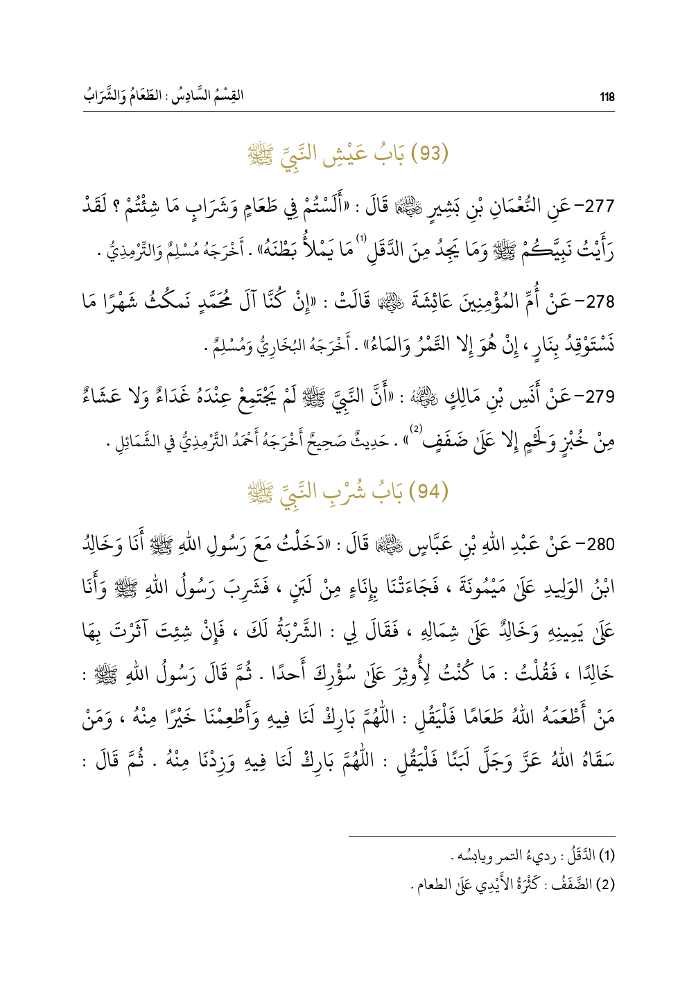 ٢٧٧ - عَنِ النُّعْمَانِ بْنِ بَشِيرٍ - رضي الله عنهما - قَالَ: «أَلَسْتُمْ فِي طَعَامٍ وَشَرَابٍ مَا شِئْتُمْ؟ لَقَدْ رَأَيْتُ نَبِيَّكُمْ - صلى الله عليه وسلم - وَمَا يَجِدُ مِنَ الدَّقَلِ (¬١) مَا يَمْلأُ بَطْنَهُ». أَخْرَجَهُ مُسْلِمٌ وَالتِّرْمِذِيُّ.