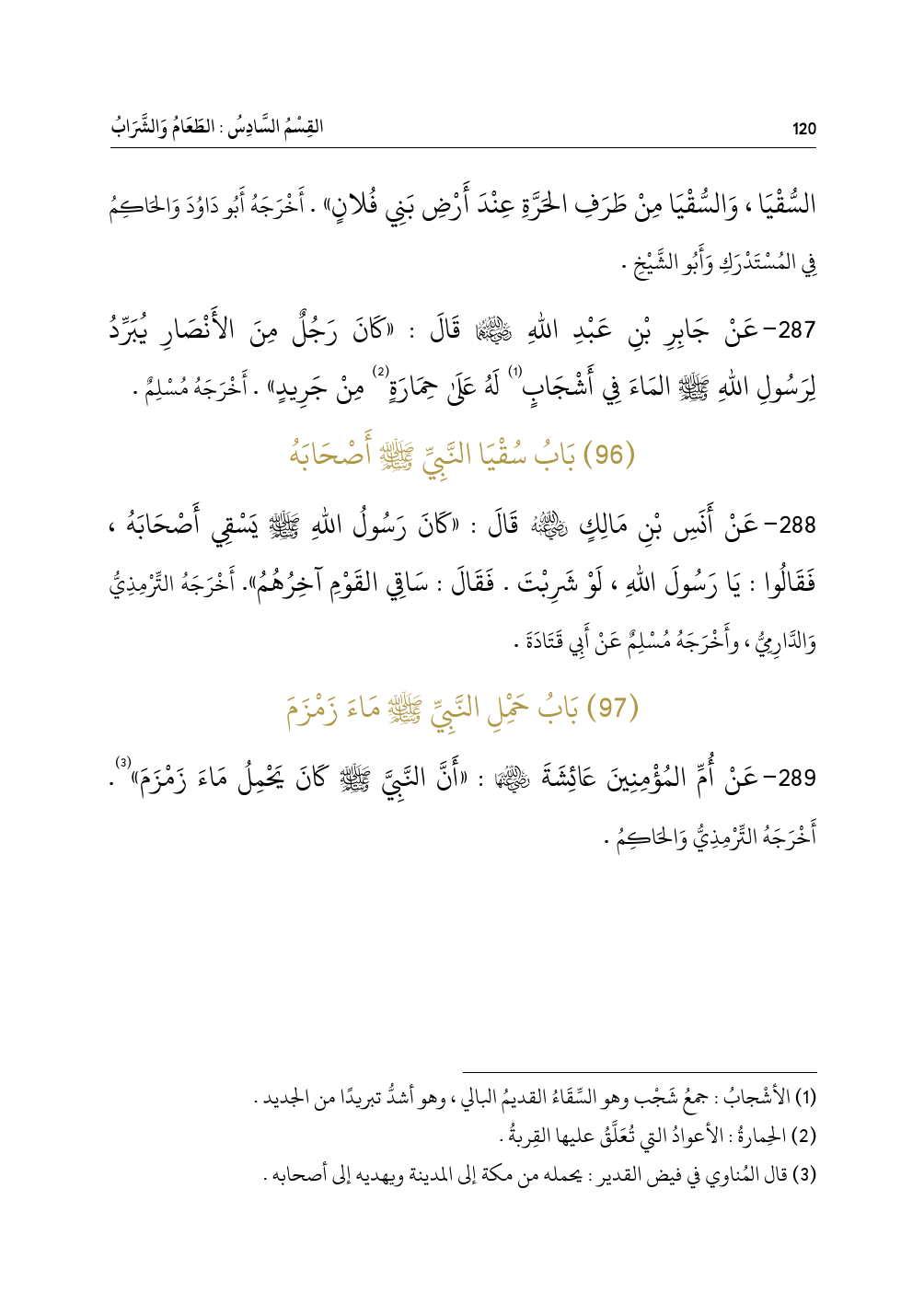 ٢٨٩ - عَنْ أُمِّ المُؤْمِنِينَ عَائِشَةَ - رضي الله عنها -: «أَنَّ النَّبِيَّ - صلى الله عليه وسلم - كَانَ يَحْمِلُ مَاءَ زَمْزَمَ» (¬٣). أَخْرَجَهُ التِّرْمِذِيُّ وَالحَاكِمُ.
