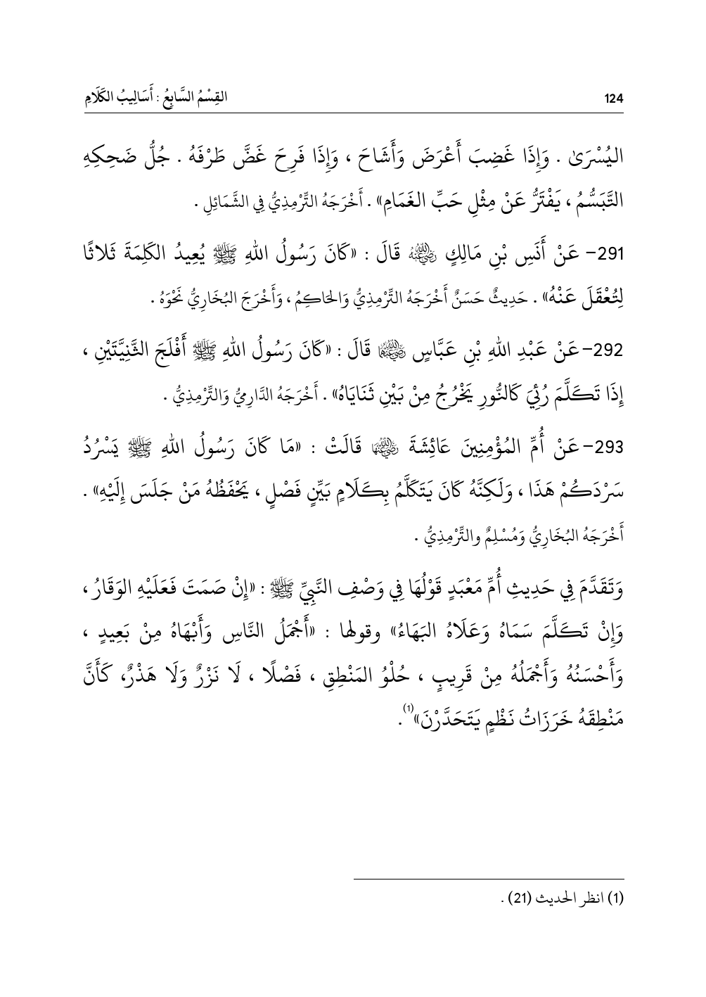 ٢٩١ - عَنْ أَنَسِ بْنِ مَالِكٍ - رضي الله عنه - قَالَ: «كَانَ رَسُولُ اللهِ - صلى الله عليه وسلم - يُعِيدُ الكَلِمَةَ ثَلاثًا لِتُعْقَلَ عَنْهُ». حَدِيثٌ حَسَنٌ أَخْرَجَهُ التِّرْمِذِيُّ وَالحَاكِمُ، وَأَخْرَجَ البُخَارِيُّ نَحْوَهُ.