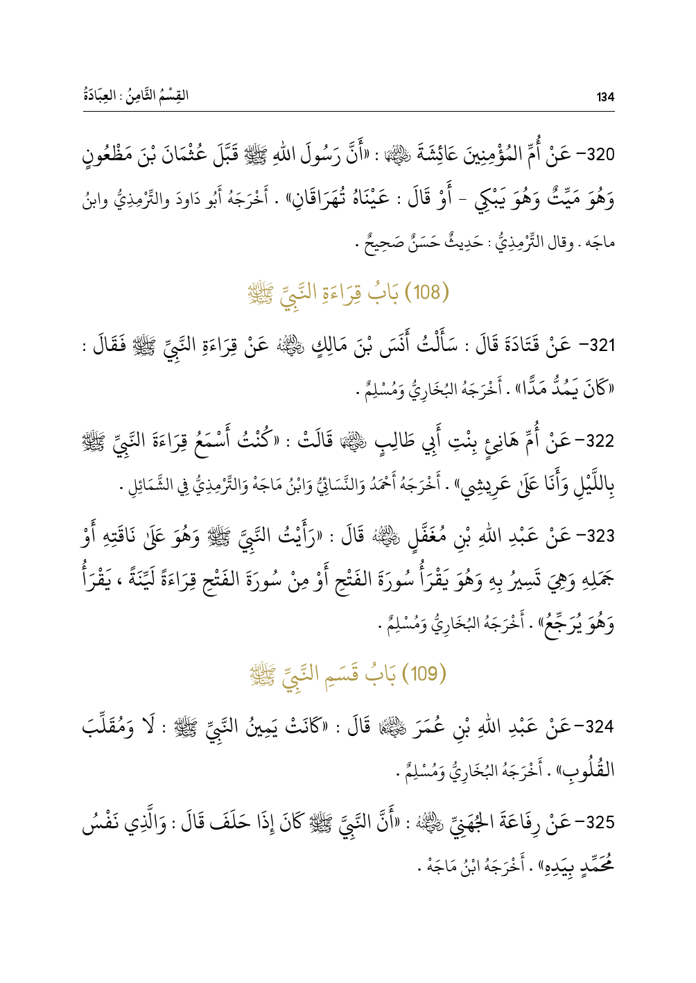 ٣٢٠ - عَنْ أُمِّ المُؤْمِنِينَ عَائِشَةَ - رضي الله عنها -: «أَنَّ رَسُولَ اللهِ - صلى الله عليه وسلم - قَبَّلَ عُثْمَانَ بْنَ مَظْعُونٍ وَهُوَ مَيِّتٌ وَهُوَ يَبْكِي - أَوْ قَالَ: عَيْنَاهُ تُهَرَاقَانِ». أَخْرَجَهُ أَبُو دَاودَ والتِّرْمِذِيُّ وابنُ ماجَه. وقال التِّرْمِذِيُّ: حَدِيثٌ حَسَنٌ صَحِيحٌ.
