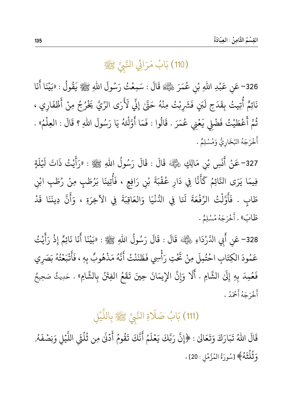 ٣٢٧ - عَنْ أَنَسِ بْنِ مَالِكٍ - رضي الله عنه - قَالَ: قَالَ رَسُولُ اللهِ - صلى الله عليه وسلم -: «رَأَيْتُ ذَاتَ لَيْلَةٍ