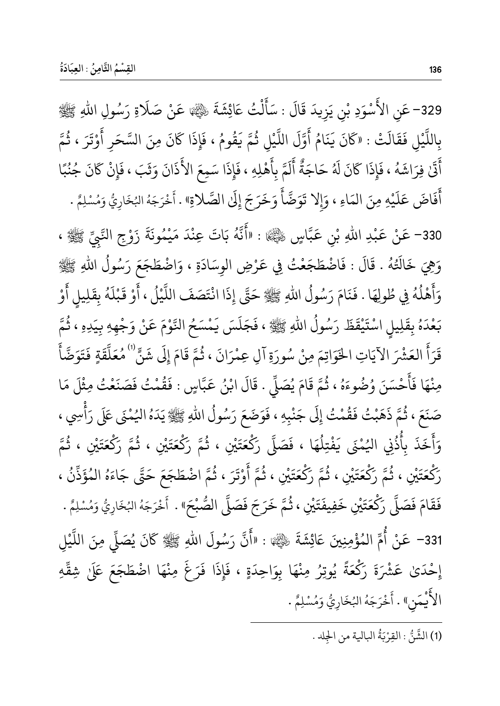 ٣٣٠ - عَنْ عَبْدِ اللهِ بْنِ عَبَّاسٍ - رضي الله عنهما -: «أَنَّهُ بَاتَ عِنْدَ مَيْمُونَةَ زَوْجِ النَّبِيِّ - صلى الله عليه وسلم -، وَهِيَ خَالَتُهُ. قَالَ: فَاضْطَجَعْتُ فِي عَرْضِ الوِسَادَةِ، وَاضْطَجَعَ رَسُولُ اللهِ - صلى الله عليه وسلم - وَأَهْلُهُ فِي طُولِهَا. فَنَامَ رَسُولُ اللهِ - صلى الله عليه وسلم - حَتَّى إِذَا انْتَصَفَ اللَّيْلُ، أَوْ قَبْلَهُ بِقَلِيلٍ أَوْ بَعْدَهُ بِقَلِيلٍ اسْتَيْقَظَ رَسُولُ اللهِ - صلى الله عليه وسلم -، فَجَلَسَ يَمْسَحُ النَّوْمَ عَنْ وَجْهِهِ بِيَدِهِ، ثُمَّ قَرَأَ العَشْرَ الآيَاتِ الخَوَاتِمَ مِنْ سُورَةِ آلِ عِمْرَانَ، ثُمَّ قَامَ إِلَى شَنٍّ (¬١) مُعَلَّقَةٍ فَتَوَضَّأَ مِنْهَا فَأَحْسَنَ وُضُوءَهُ، ثُمَّ قَامَ يُصَلِّي. قَالَ ابْنُ عَبَّاسٍ: فَقُمْتُ فَصَنَعْتُ مِثْلَ مَا صَنَعَ، ثُمَّ ذَهَبْتُ فَقُمْتُ إِلَى جَنْبِهِ، فَوَضَعَ رَسُولُ اللهِ - صلى الله عليه وسلم - يَدَهُ اليُمْنَى عَلَى رَأْسِي، وَأَخَذَ بِأُذُنِي اليُمْنَى يَفْتِلُهَا، فَصَلَّى رَكْعَتَيْنِ، ثُمَّ رَكْعَتَيْنِ، ثُمَّ رَكْعَتَيْنِ، ثُمَّ