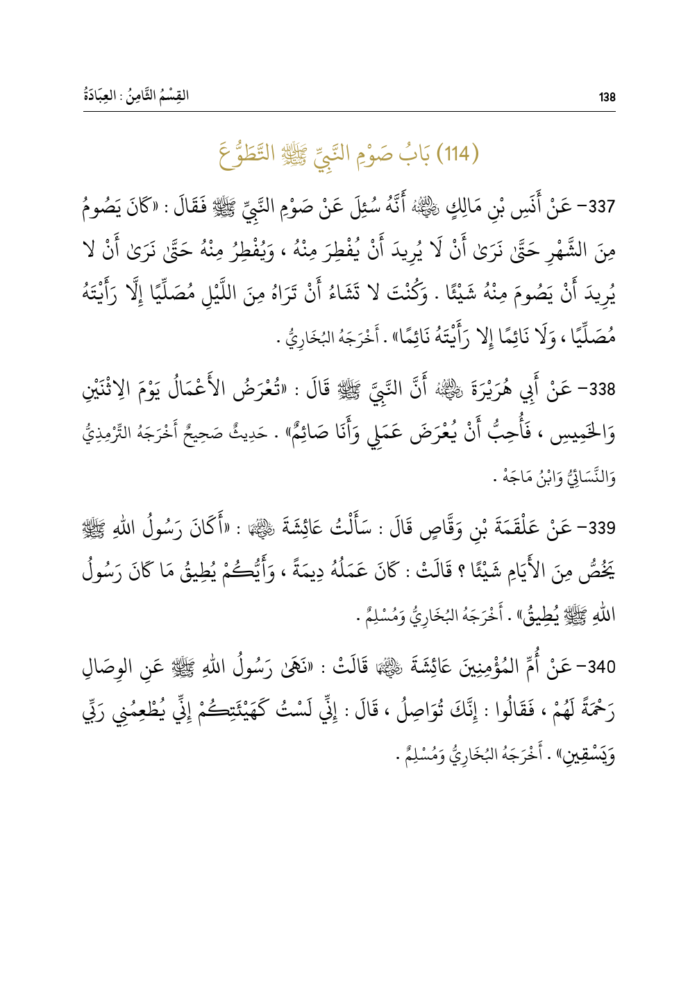 ٣٣٨ - عَنْ أَبِي هُرَيْرَةَ - رضي الله عنه - أَنَّ النَّبِيَّ - صلى الله عليه وسلم - قَالَ: «تُعْرَضُ الأَعْمَالُ يَوْمَ الِاثْنَيْنِ وَالخَمِيسِ، فَأُحِبُّ أَنْ يُعْرَضَ عَمَلِي وَأَنَا صَائِمٌ». حَدِيثٌ صَحِيحٌ أَخْرَجَهُ التِّرْمِذِيُّ وَالنَّسَائِيُّ وَابْنُ مَاجَهْ.