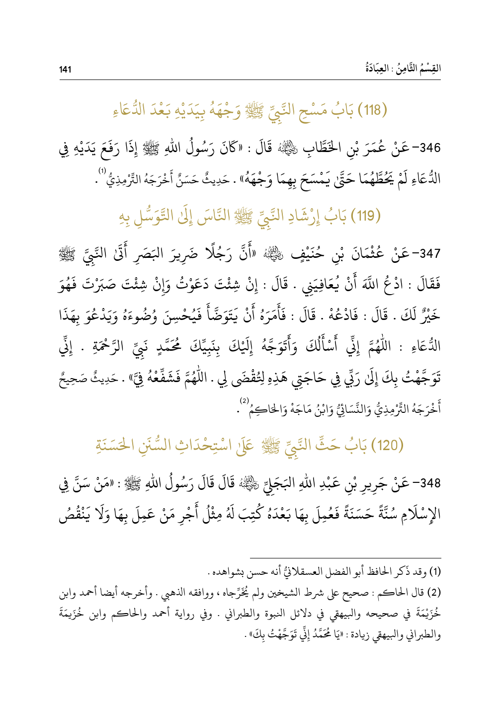 ٣٤٦ - عَنْ عُمَرَ بْنِ الخَطَّابِ - رضي الله عنه - قَالَ: «كَانَ رَسُولُ اللهِ - صلى الله عليه وسلم - إِذَا رَفَعَ يَدَيْهِ فِي الدُّعَاءِ لَمْ يَحُطَّهُمَا حَتَّى يَمْسَحَ بِهِمَا وَجْهَهُ». حَدِيثٌ حَسَنٌ أَخْرَجَهُ التِّرْمِذِيُّ (¬١).