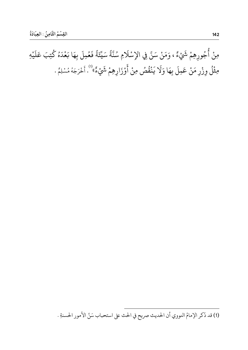 مِنْ أُجُورِهِمْ شَيْءٌ، وَمَنْ سَنَّ فِي الإِسْلَامِ سُنَّةً سَيِّئَةً فَعُمِلَ بِهَا بَعْدَهُ كُتِبَ عَلَيْهِ مِثْلُ وِزْرِ مَنْ عَمِلَ بِهَا وَلَا يَنْقُصُ مِنْ أَوْزَارِهِمْ شَيْءٌ» (¬١). أَخْرَجَهُ مُسْلِمٌ.