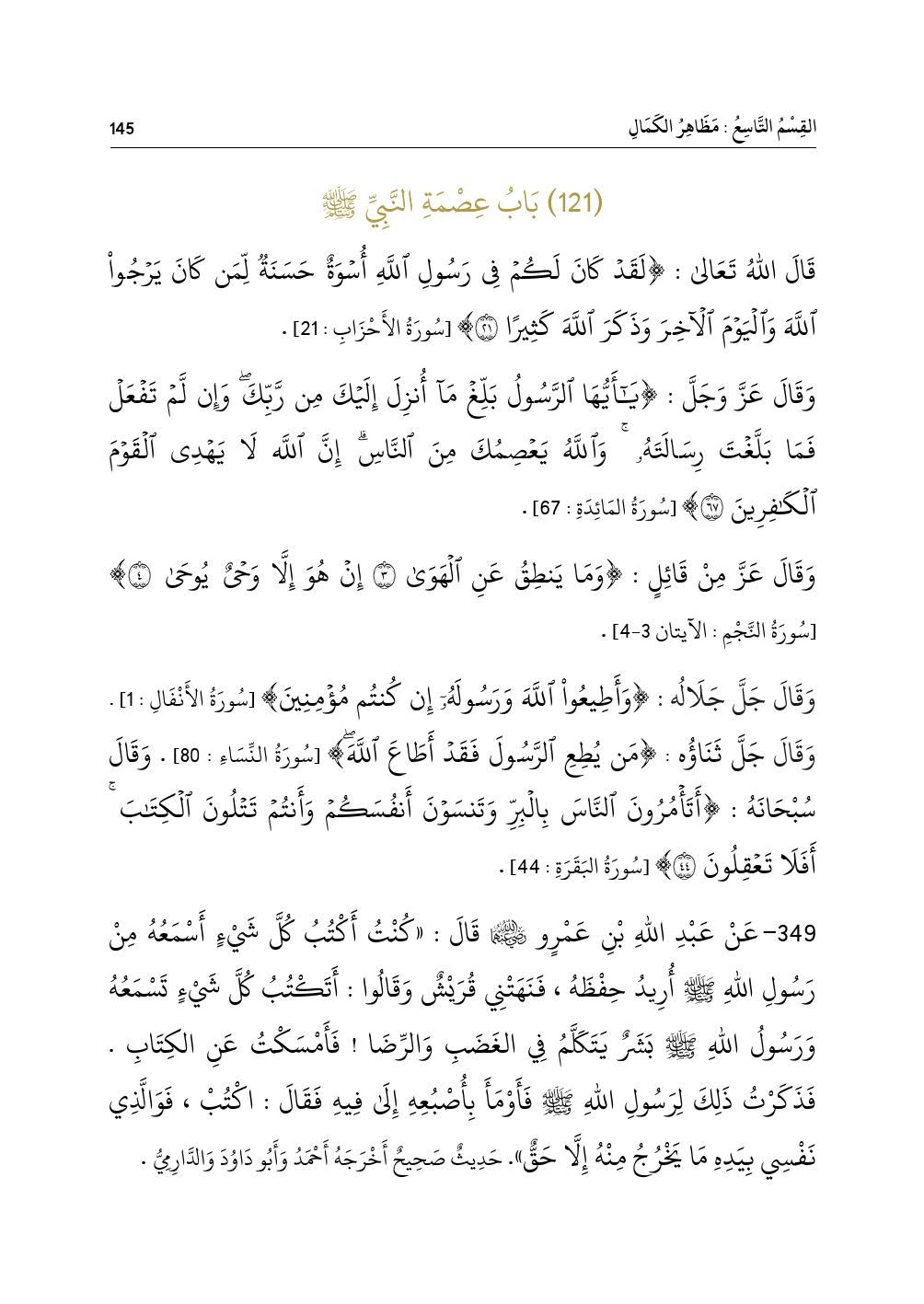 ٣٤٩ - عَنْ عَبْدِ اللهِ بْنِ عَمْرٍو - رضي الله عنهما - قَالَ: «كُنْتُ أَكْتُبُ كُلَّ شَيْءٍ أَسْمَعُهُ مِنْ رَسُولِ اللهِ - صلى الله عليه وسلم - أُرِيدُ حِفْظَهُ، فَنَهَتْنِي قُرَيْشٌ وَقَالُوا: أَتَكْتُبُ كُلَّ شَيْءٍ تَسْمَعُهُ وَرَسُولُ اللهِ - صلى الله عليه وسلم - بَشَرٌ يَتَكَلَّمُ فِي الغَضَبِ وَالرِّضَا! فَأَمْسَكْتُ عَنِ الكِتَابِ. فَذَكَرْتُ ذَلِكَ لِرَسُولِ اللهِ - صلى الله عليه وسلم - فَأَوْمَأَ بِأُصْبُعِهِ إِلَى فِيهِ فَقَالَ: اكْتُبْ، فَوَالَّذِي نَفْسِي بِيَدِهِ مَا يَخْرُجُ مِنْهُ إِلَّا حَقٌّ». حَدِيثٌ صَحِيحٌ أَخْرَجَهُ أَحْمَدُ وَأَبُو دَاوُدَ وَالدَّارِمِيُّ.
