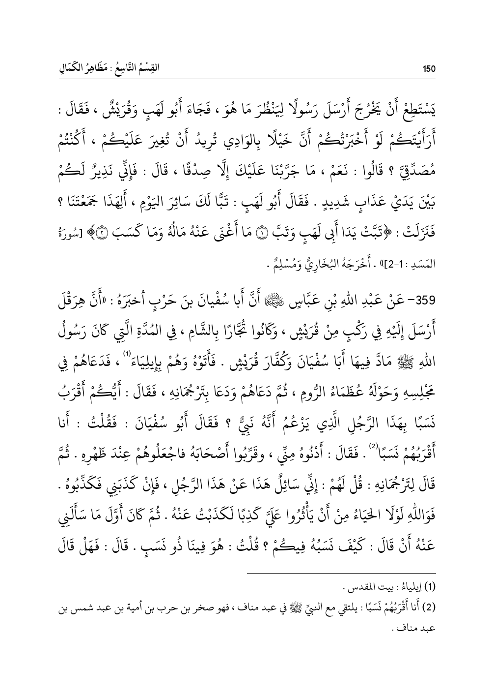 ٣٥٩ - عَنْ عَبْدِ اللهِ بْنِ عَبَّاسٍ - رضي الله عنهما - أَنَّ أَبا سُفْيانَ بنَ حَرْبٍ أخبَرَهُ: «أَنَّ هِرَقْلَ أَرْسَلَ إِلَيْهِ فِي رَكْبٍ مِنْ قُرَيْشٍ، وَكَانُوا تُجَّارًا بِالشَّامِ، فِي المُدَّةِ الَّتِي كَانَ رَسُولُ اللهِ - صلى الله عليه وسلم - مَادَّ فِيهَا أَبَا سُفْيَانَ وَكُفَّارَ قُرَيْشٍ. فَأَتَوْهُ وَهُمْ بِإِيلِيَاءَ (¬١)، فَدَعَاهُمْ فِي مَجْلِسِهِ وَحَوْلَهُ عُظَمَاءُ الرُّومِ، ثُمَّ دَعَاهُمْ وَدَعَا بِتَرْجُمَانِهِ، فَقَالَ: أَيُّكُمْ أَقْرَبُ نَسَبًا بِهَذَا الرَّجُلِ الَّذِي يَزْعُمُ أَنَّهُ نَبِيٌّ؟ فَقَالَ أَبُو سُفْيَانَ: فَقُلْتُ: أَنا أَقْرَبُهُمْ نَسَبًا (¬٢). فَقَالَ: أَدْنُوهُ مِنِّي، وقَرِّبُوا أَصْحَابَهُ فاجْعَلُوهُمْ عِنْدَ ظَهْرِهِ. ثُمَّ قَالَ لِتَرْجُمَانِهِ: قُلْ لَهُمْ: إِنِّي سَائِلٌ هَذَا عَنْ هَذَا الرَّجُلِ، فَإِنْ كَذَبَنِي فَكَذِّبُوهُ. فَوَاللّاهِ لَوْلَا الحَيَاءُ مِنْ أَنْ يَأْثُرُوا عَلَيَّ كَذِبًا لَكَذَبْتُ عَنْهُ. ثُمَّ كَانَ أَوَّلَ مَا سَأَلَنِي عَنْهُ أَنْ قَالَ: كَيْفَ نَسَبُهُ فِيكُمْ؟ قُلْتُ: هُوَ فِينَا ذُو نَسَبٍ. قَالَ: فَهَلْ قَالَ
