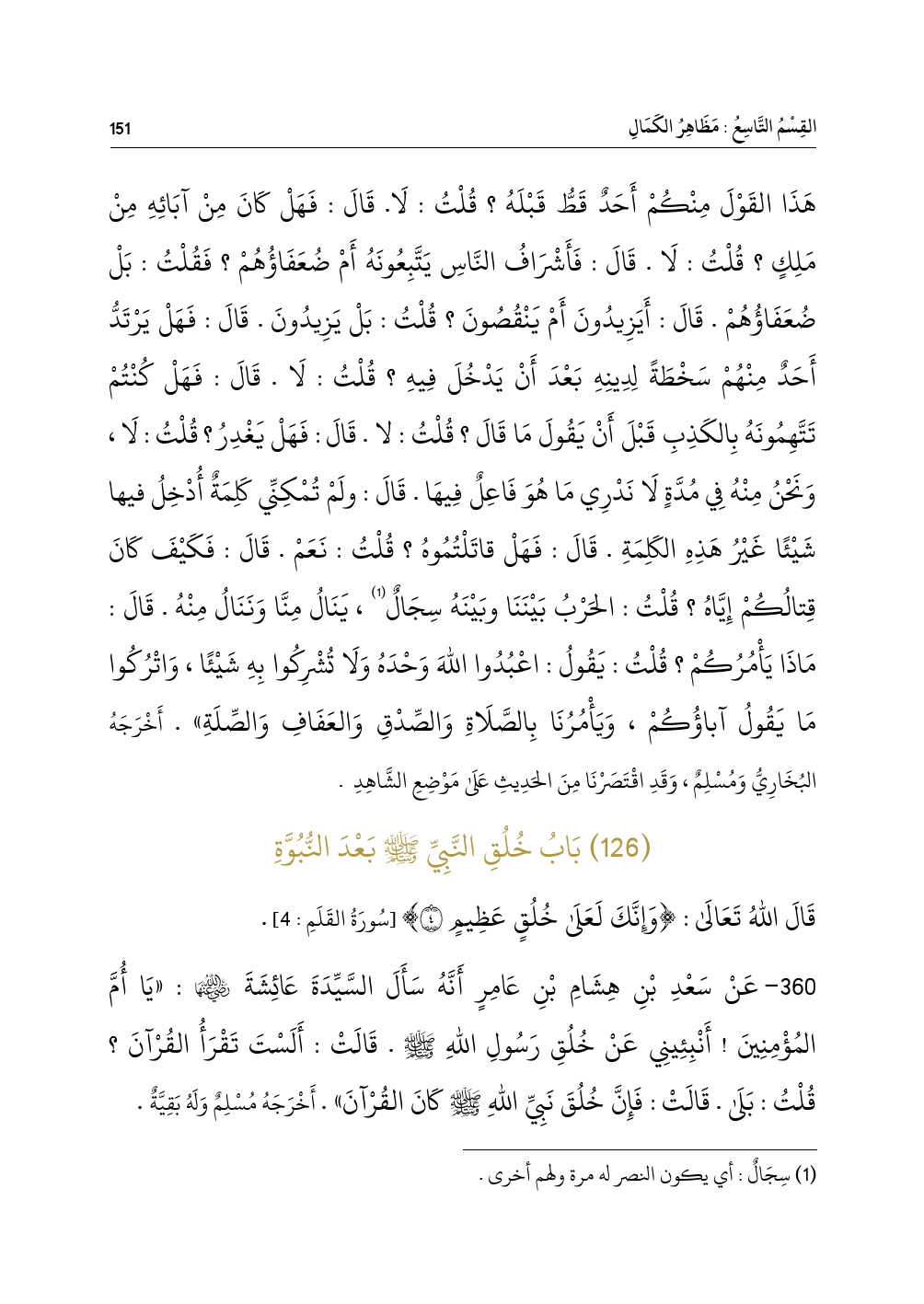 قُلْتُ: بَلَى. قَالَتْ: فَإِنَّ خُلُقَ نَبِيِّ اللهِ - صلى الله عليه وسلم - كَانَ القُرْآنَ». أَخْرَجَهُ مُسْلِمٌ وَلَهُ بَقِيَّةٌ.