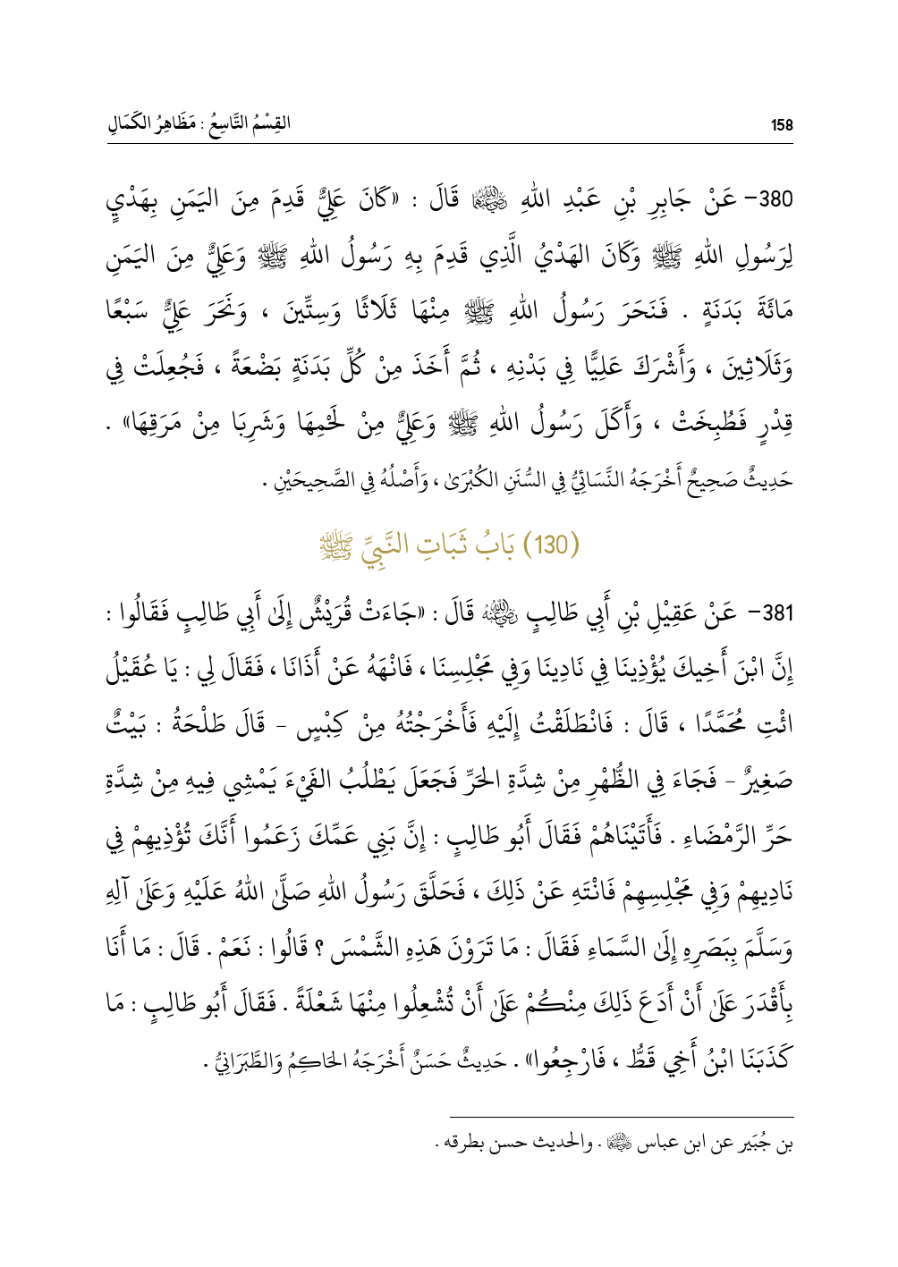 ٣٨١ - عَنْ عَقِيْلِ بْنِ أَبِي طَالِبٍ - رضي الله عنه - قَالَ: «جَاءَتْ قُرَيْشٌ إِلَى أَبِي طَالِبٍ فَقَالُوا: إِنَّ ابْنَ أَخِيكَ يُؤْذِينَا فِي نَادِينَا وَفِي مَجْلِسِنَا، فَانْهَهُ عَنْ أَذَانَا، فَقَالَ لِي: يَا عُقَيْلُ ائْتِ مُحَمَّدًا، قَالَ: فَانْطَلَقْتُ إِلَيْهِ فَأَخْرَجْتُهُ مِنْ كِبْسٍ - قَالَ طَلْحَةُ: بَيْتٌ صَغِيرٌ - فَجَاءَ فِي الظُّهْرِ مِنْ شِدَّةِ الحَرِّ فَجَعَلَ يَطْلُبُ الفَيْءَ يَمْشِي فِيهِ مِنْ شِدَّةِ حَرِّ الرَّمْضَاءِ. فَأَتَيْنَاهُمْ فَقَالَ أَبُو طَالِبٍ: إِنَّ بَنِي عَمِّكَ زَعَمُوا أَنَّكَ تُؤْذِيهِمْ فِي نَادِيهِمْ وَفِي مَجْلِسِهِمْ فَانْتَهِ عَنْ ذَلِكَ، فَحَلَّقَ رَسُولُ اللهِ صَلَّى اللهُ عَلَيْهِ وَعَلَى آلِهِ وَسَلَّمَ بِبَصَرِهِ إِلَى السَّمَاءِ فَقَالَ: مَا تَرَوْنَ هَذِهِ الشَّمْسَ؟ قَالُوا: نَعَمْ. قَالَ: مَا أَنَا بِأَقْدَرَ عَلَى أَنْ أَدَعَ ذَلِكَ مِنْكُمْ عَلَى أَنْ تُشْعِلُوا مِنْهَا شَعْلَةً. فَقَالَ أَبُو طَالِبٍ: مَا كَذَبَنَا ابْنُ أَخِي قَطُّ، فَارْجِعُوا». حَدِيثٌ حَسَنٌ أَخْرَجَهُ الحَاكِمُ وَالطَّبَرَانِيُّ.