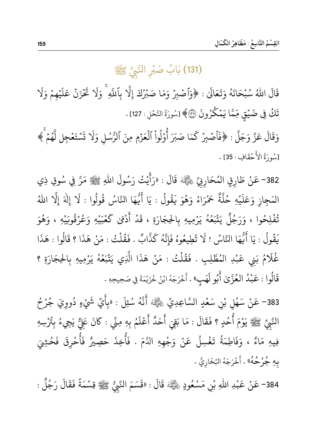 ٣٨٢ - عَنْ طَارِقٍ المُحَارِبِيِّ - رضي الله عنه - قَالَ: «رَأَيْتُ رَسُولَ اللهِ - صلى الله عليه وسلم - مَرَّ فِي سُوقِ ذِي المَجِازِ وَعَلَيْهِ حُلَّةٌ حَمْرَاءُ وَهُوَ يَقُولُ: يَا أَيُّهَا النَّاسُ قُولُوا: لَا إِلهَ إِلَّا اللهُ تُفْلِحُوا، وَرَجُلٌ يَتْبَعُهُ يَرْمِيهِ بِالحِجَارَةِ، قَدْ أَدْمَى كَعْبَيْهِ وَعُرْقُوبَيْهِ، وَهُوَ
