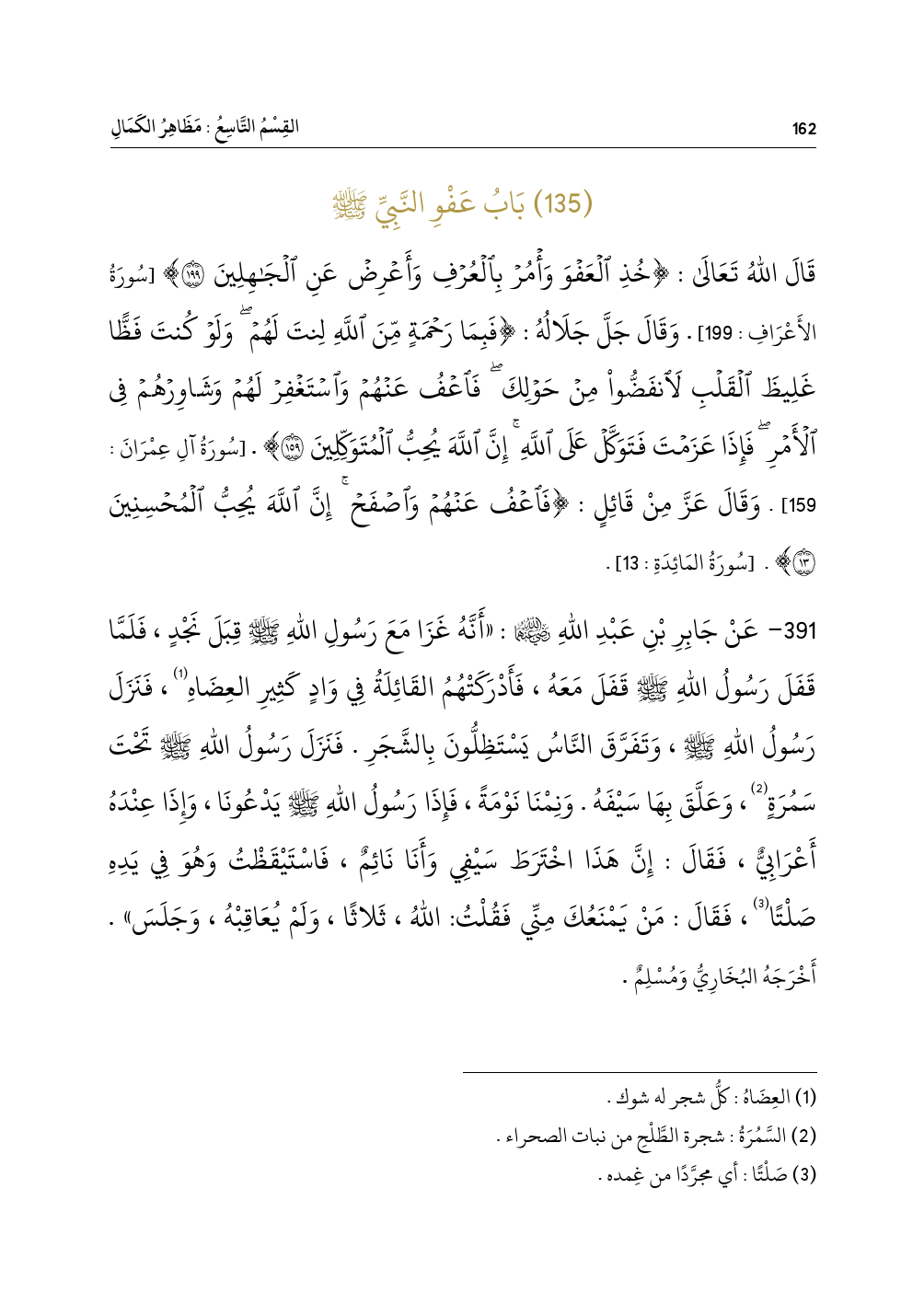 ٣٩١ - عَنْ جَابِرِ بْنِ عَبْدِ اللهِ - رضي الله عنهما -: «أَنَّهُ غَزَا مَعَ رَسُولِ اللهِ - صلى الله عليه وسلم - قِبَلَ نَجْدٍ، فَلَمَّا قَفَلَ رَسُولُ اللهِ - صلى الله عليه وسلم - قَفَلَ مَعَهُ، فَأَدْرَكَتْهُمُ القَائِلَةُ فِي وَادٍ كَثِيرِ العِضَاهِ (¬١)، فَنَزَلَ رَسُولُ اللهِ - صلى الله عليه وسلم -، وَتَفَرَّقَ النَّاسُ يَسْتَظِلُّونَ بِالشَّجَرِ. فَنَزَلَ رَسُولُ اللهِ - صلى الله عليه وسلم - تَحْتَ سَمُرَةٍ (¬٢)، وَعَلَّقَ بِهَا سَيْفَهُ. وَنِمْنَا نَوْمَةً، فَإِذَا رَسُولُ اللهِ - صلى الله عليه وسلم - يَدْعُونَا، وَإِذَا عِنْدَهُ أَعْرَابِيٌّ، فَقَالَ: إِنَّ هَذَا اخْتَرَطَ سَيْفِي وَأَنَا نَائِمٌ، فَاسْتَيْقَظْتُ وَهُوَ فِي يَدِهِ