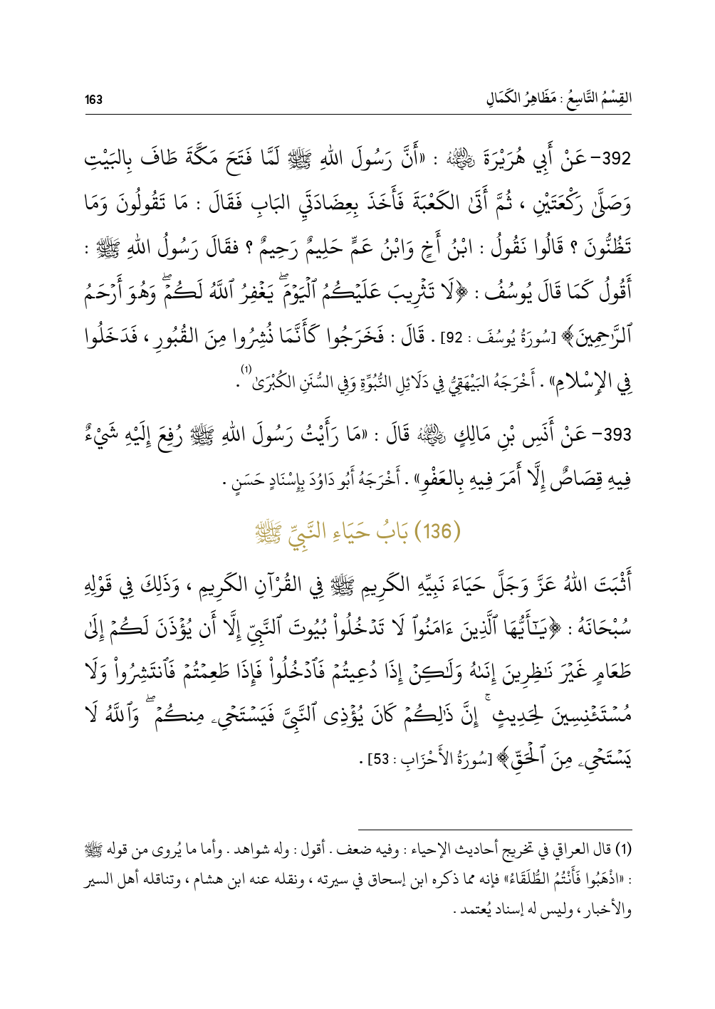 ٣٩٢ - عَنْ أَبِي هُرَيْرَةَ - رضي الله عنه -: «أَنَّ رَسُولَ اللهِ - صلى الله عليه وسلم - لَمَّا فَتَحَ مَكَّةَ طَافَ بِالبَيْتِ وَصَلَّى رَكْعَتَيْنِ، ثُمَّ أَتَى الكَعْبَةَ فَأَخَذَ بِعِضَادَتَيِ البَابِ فَقَالَ: مَا تَقُولُونَ وَمَا تَظُنُّونَ؟ قَالُوا نَقُولُ: ابْنُ أَخٍ وَابْنُ عَمٍّ حَلِيمٌ رَحِيمٌ؟ فقَالَ رَسُولُ اللهِ - صلى الله عليه وسلم -: أَقُولُ كَمَا قَالَ يُوسُفُ: {لَا تَثْرِيبَ عَلَيْكُمُ الْيَوْمَ يَغْفِرُ اللَّهُ لَكُمْ وَهُوَ أَرْحَمُ الرَّاحِمِينَ} [سُورَةُ يُوسُفَ: ٩٢]. قَالَ: فَخَرَجُوا كَأَنَّمَا نُشِرُوا مِنَ القُبُورِ، فَدَخَلُوا فِي الإِسْلامِ». أَخْرَجَهُ البَيْهَقِيُّ فِي دَلَائِلِ النُّبُوِّةِ وَفِي السُّنَنِ الكُبْرَى (¬١).