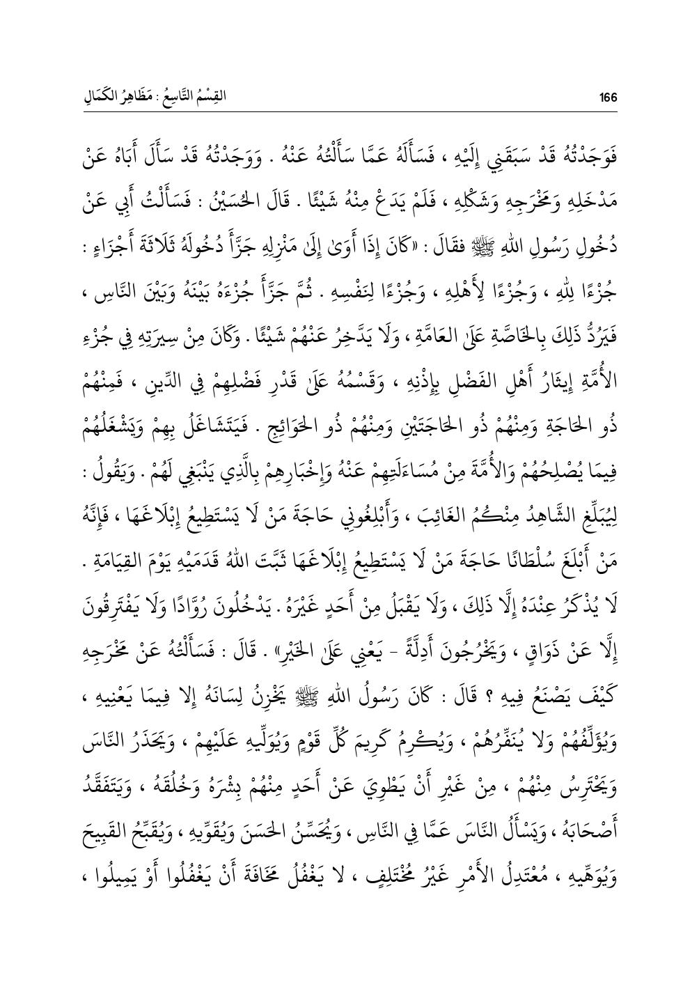 فَوَجَدْتُهُ قَدْ سَبَقَنِي إِلَيْهِ، فَسَأَلَهُ عَمَّا سَأَلْتُهُ عَنْهُ. وَوَجَدْتُهُ قَدْ سَأَلَ أَبَاهُ عَنْ مَدْخَلِهِ وَمَخْرَجِهِ وَشَكْلِهِ، فَلَمْ يَدَعْ مِنْهُ شَيْئًا. قَالَ الحُسَيْنُ: فَسَأَلْتُ أَبِي عَنْ دُخُولِ رَسُولِ اللهِ - صلى الله عليه وسلم - فقَالَ: «كَانَ إِذَا أَوَى إِلَى مَنْزِلِهِ جَزَّأَ دُخُولَهُ ثَلَاثَةَ أَجْزَاءٍ: جُزْءًا لِلّاهِ، وَجُزْءًا لِأَهْلِهِ، وَجُزْءًا لِنَفْسِهِ. ثُمَّ جَزَّأَ جُزْءَهُ بَيْنَهُ وَبَيْنَ النَّاسِ، فَيَرُدُّ ذَلِكَ بِالخَاصَّةِ عَلَى العَامَّةِ، وَلَا يَدَّخِرُ عَنْهُمْ شَيْئًا. وَكَانَ مِنْ سِيرَتِهِ فِي جُزْءِ الأُمَّةِ إِيثَارُ أَهْلِ الفَضْلِ بِإِذْنِهِ، وَقَسْمُهُ عَلَى قَدْرِ فَضْلِهِمْ فِي الدِّينِ، فَمِنْهُمْ