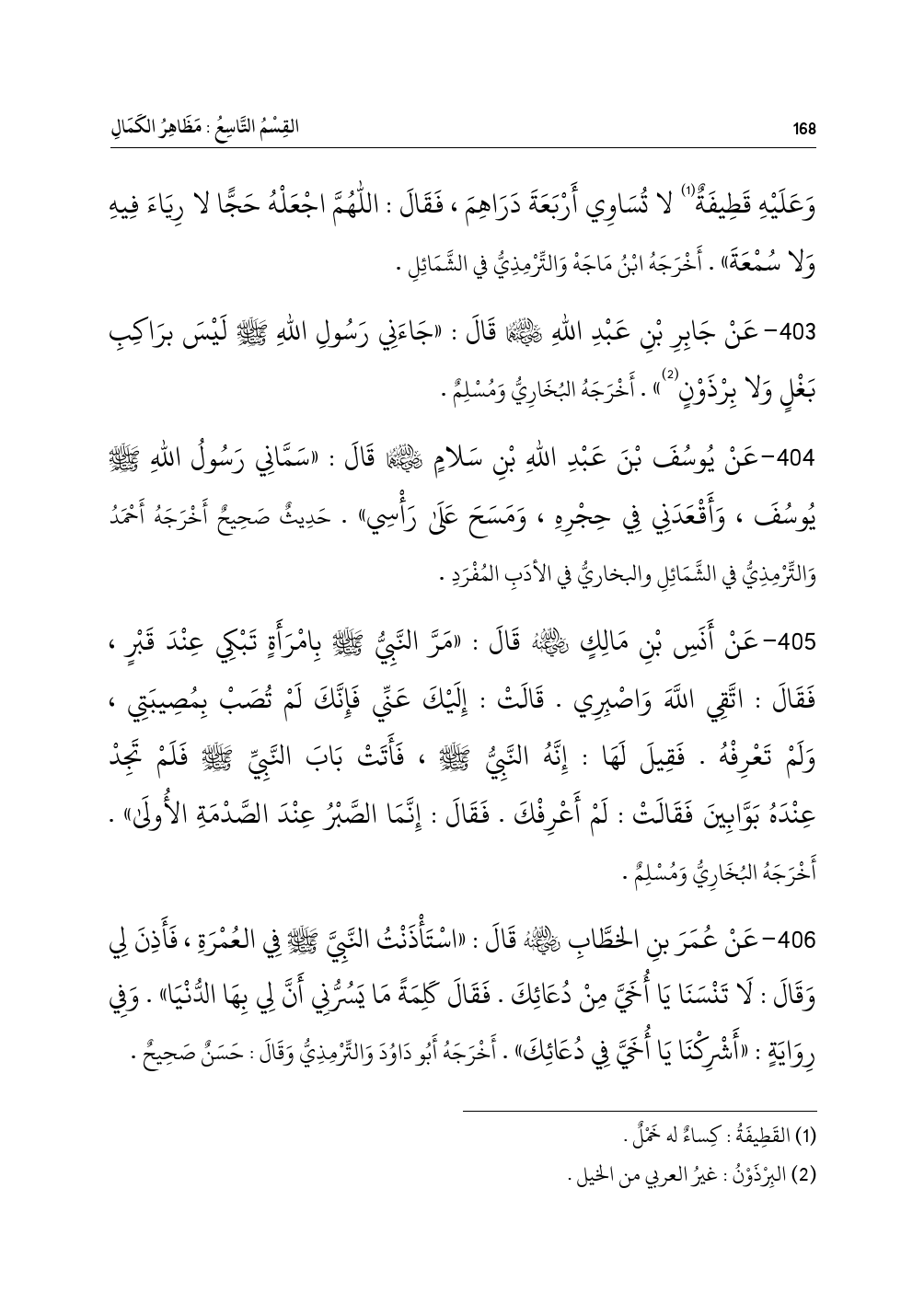 ٤٠٦ - عَنْ عُمَرَ بنِ الخطَّابِ - رضي الله عنه - قَالَ: «اسْتَأْذَنْتُ النَّبِيَّ - صلى الله عليه وسلم - فِي العُمْرَةِ، فَأَذِنَ لِي وَقَالَ: لَا تَنْسَنَا يَا أُخَيَّ مِنْ دُعَائِكَ. فَقَالَ كَلِمَةً مَا يَسُرُّنِي أَنَّ لِي بِهَا الدُّنْيَا». وَفِي رِوَايَةٍ: «أَشْرِكْنَا يَا أُخَيَّ فِي دُعَائِكَ». أَخْرَجَهُ أَبُو دَاوُدَ وَالتِّرْمِذِيُّ وَقَالَ: حَسَنٌ صَحِيحٌ.