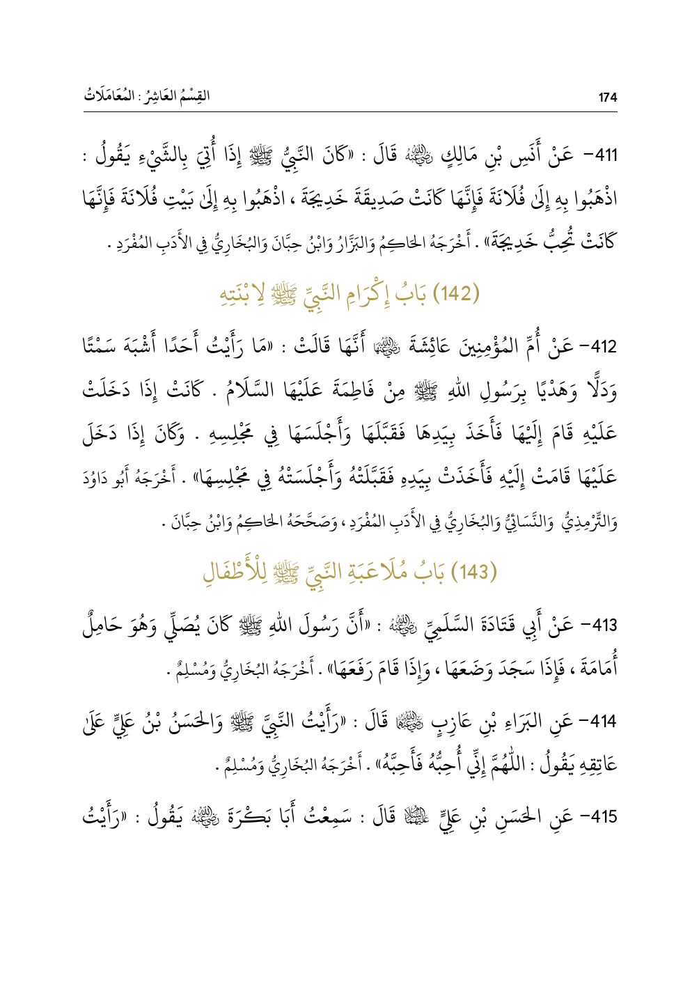 ٤١١ - عَنْ أَنَسِ بْنِ مَالِكٍ - رضي الله عنه - قَالَ: «كَانَ النَّبِيُّ - صلى الله عليه وسلم - إِذَا أُتِيَ بِالشَّيْءِ يَقُولُ: اذْهَبُوا بِهِ إِلَى فُلَانَةَ فَإِنَّهَا كَانَتْ صَدِيقَةَ خَدِيجَةَ، اذْهَبُوا بِهِ إِلَى بَيْتِ فُلَانَةَ فَإِنَّهَا كَانَتْ تُحِبُّ خَدِيجَةَ». أَخْرَجَهُ الحَاكِمُ وَالبَزَّارُ وَابْنُ حِبَّانَ وَالبُخَارِيُّ فِي الأَدَبِ المُفْرَدِ.