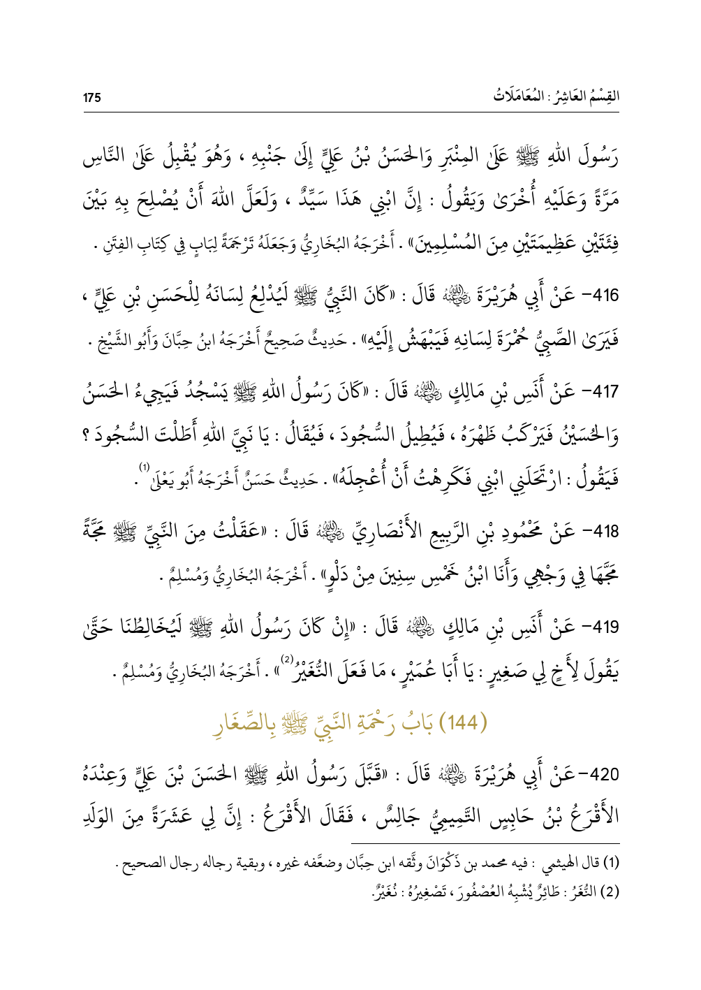 ٤١٧ - عَنْ أَنَسِ بْنِ مَالِكٍ - رضي الله عنه - قَالَ: «كَانَ رَسُولُ اللهِ - صلى الله عليه وسلم - يَسْجُدُ فَيَجِيءُ الحَسَنُ وَالحُسَيْنُ فَيَرْكَبُ ظَهْرَهُ، فَيُطِيلُ السُّجُودَ، فَيُقَالُ: يَا نَبِيَّ اللهِ أَطَلْتَ السُّجُودَ؟ فَيَقُولُ: ارْتَحَلَنِي ابْنِي فَكَرِهْتُ أَنْ أُعْجِلَهُ». حَدِيثٌ حَسَنٌ أَخْرَجَهُ أَبُو يَعْلَى (¬١).