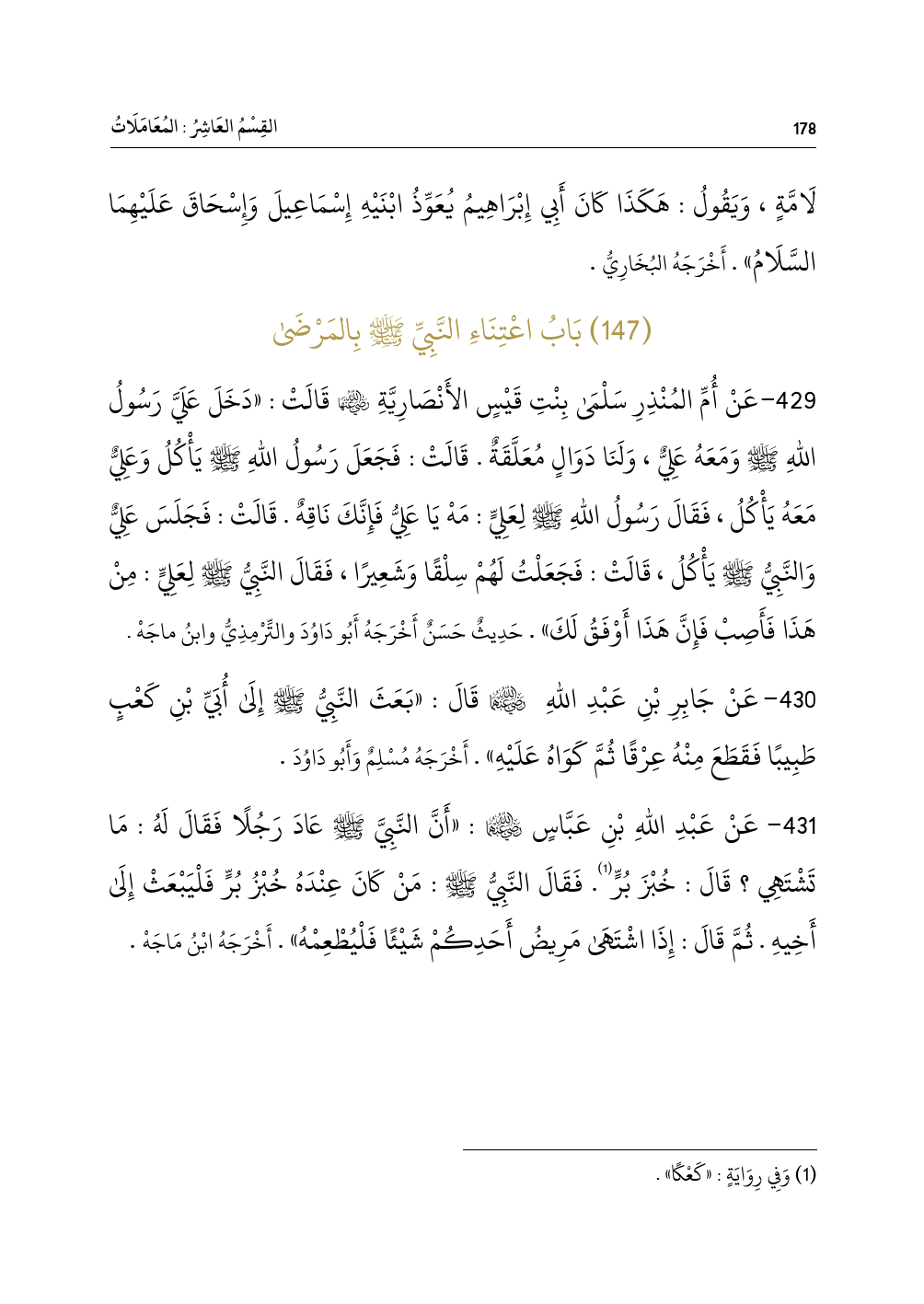 ٤٢٩ - عَنْ أُمِّ المُنْذِرِ سَلْمَى بِنْتِ قَيْسٍ الأَنْصَارِيَّةِ - رضي الله عنها - قَالَتْ: «دَخَلَ عَلَيَّ رَسُولُ اللهِ - صلى الله عليه وسلم - وَمَعَهُ عَلِيٌّ، وَلَنَا دَوَالٍ مُعَلَّقَةٌ. قَالَتْ: فَجَعَلَ رَسُولُ اللهِ - صلى الله عليه وسلم - يَأْكُلُ وَعَلِيٌّ مَعَهُ يَأْكُلُ، فَقَالَ رَسُولُ اللهِ - صلى الله عليه وسلم - لِعَلِيٍّ: مَهْ يَا عَلِيُّ فَإِنَّكَ نَاقِهٌ. قَالَتْ: فَجَلَسَ عَلِيٌّ وَالنَّبِيُّ - صلى الله عليه وسلم - يَأْكُلُ، قَالَتْ: فَجَعَلْتُ لَهُمْ سِلْقًا وَشَعِيرًا، فَقَالَ النَّبِيُّ - صلى الله عليه وسلم - لِعَلِيٍّ: مِنْ هَذَا فَأَصِبْ فَإِنَّ هَذَا أَوْفَقُ لَكَ». حَدِيثٌ حَسَنٌ أَخْرَجَهُ أَبُو دَاوُدَ والتِّرْمِذِيُّ وابنُ ماجَهْ.