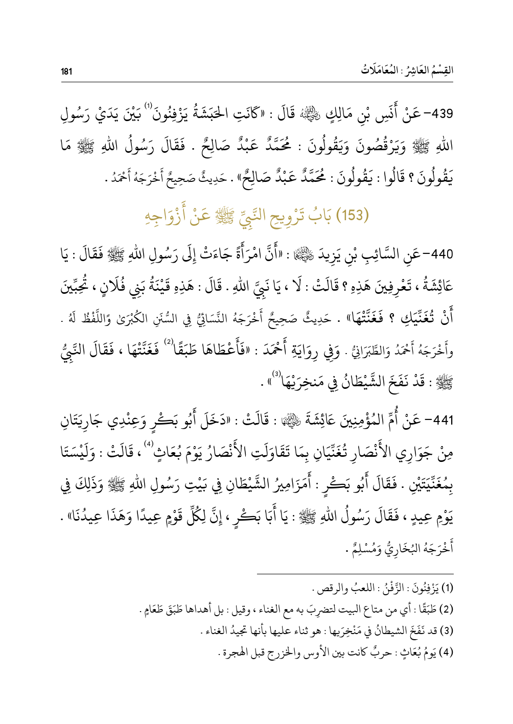 ٤٤١ - عَنْ أُمِّ المُؤْمِنِينَ عَائِشَةَ - رضي الله عنها -: قَالَتْ: «دَخَلَ أَبُو بَكْرٍ وَعِنْدِي جَارِيَتَانِ مِنْ جَوَارِي الأَنْصَارِ تُغَنِّيَانِ بِمَا تَقَاوَلَتِ الأَنْصَارُ يَوْمَ بُعَاثٍ (¬٤)، قَالَتْ: وَلَيْسَتَا بِمُغَنِّيَتَيْنِ. فَقَالَ أَبُو بَكْرٍ: أَمَزَامِيرُ الشَّيْطَانِ فِي بَيْتِ رَسُولِ اللهِ - صلى الله عليه وسلم - وَذَلِكَ فِي يَوْمِ عِيدٍ، فَقَالَ رَسُولُ اللهِ - صلى الله عليه وسلم -: يَا أَبَا بَكْرٍ، إِنَّ لِكُلِّ قَوْمٍ عِيدًا وَهَذَا عِيدُنَا». أَخْرَجَهُ البُخَارِيُّ وَمُسْلِمٌ.