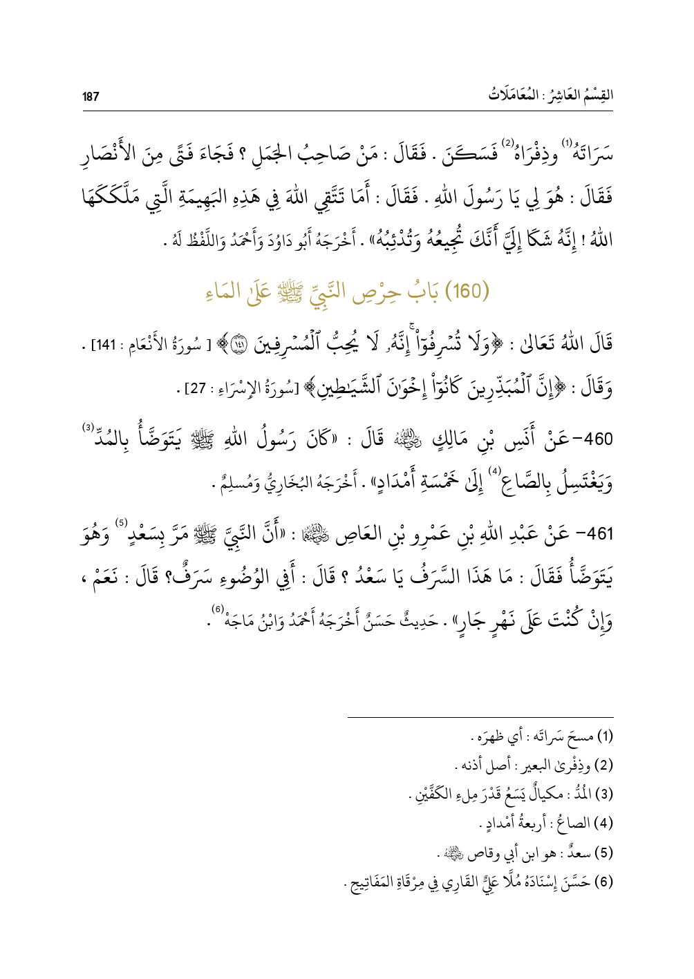 ٤٦١ - عَنْ عَبْدِ اللهِ بْنِ عَمْرِو بْنِ العَاصِ - رضي الله عنهما -: «أَنَّ النَّبِيَّ - صلى الله عليه وسلم - مَرَّ بِسَعْدٍ (¬٥) وَهُوَ يَتَوَضَّأُ فَقَالَ: مَا هَذَا السَّرَفُ يَا سَعْدُ؟ قَالَ: أَفِي الوُضُوءِ سَرَفٌ؟ قَالَ: نَعَمْ، وَإِنْ كُنْتَ عَلَى نَهْرٍ جَارٍ». حَدِيثٌ حَسَنٌ أَخْرَجَهُ أَحْمَدُ وَابْنُ مَاجَهْ (¬٦).