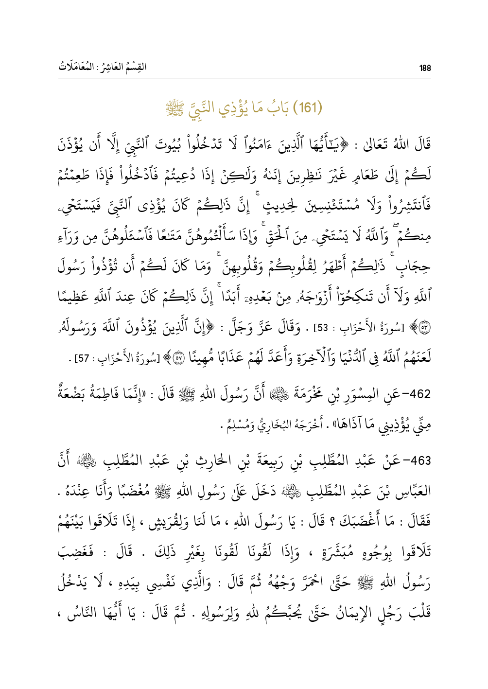 قَالَ اللهُ تَعَالى: {يَاأَيُّهَا الَّذِينَ آمَنُوا لَا تَدْخُلُوا بُيُوتَ النَّبِيِّ إِلَّا أَن يُؤْذَنَ لَكُمْ إِلَى طَعَامٍ غَيْرَ نَاظِرِينَ إِنَاهُ وَلَكِنْ إِذَا دُعِيتُمْ فَادْخُلُوا فَإِذَا طَعِمْتُمْ فَانتَشِرُوا وَلَا مُسْتَئْنِسِينَ لِحَدِيثٍ إِنَّ ذَلِكُمْ كَانَ يُؤْذِي النَّبِيَّ فَيَسْتَحْيِ مِنكُمْ وَاللَّهُ لَا يَسْتَحْيِ مِنَ الْحَقِّ وَإِذَا سَأَلْتُمُوهُنَّ مَتَاعًا فَاسْئَلُوهُنَّ مِن وَرَاءِ حِجَابٍ ذَلِكُمْ أَطْهَرُ لِقُلُوبِكُمْ وَقُلُوبِهِنَّ وَمَا كَانَ لَكُمْ أَن تُؤْذُوا رَسُولَ اللَّهِ وَلَا أَن تَنكِحُوا أَزْوَاجَهُ مِن بَعْدِهِ أَبَدًا إِنَّ ذَلِكُمْ كَانَ عِندَ اللَّهِ عَظِيمًا (٥٣)} [سُورَةُ الأَحْزَابِ: ٥٣]. وَقَالَ عَزَّ وَجَلَّ: {إِنَّ الَّذِينَ يُؤْذُونَ اللَّهَ وَرَسُولَهُ لَعَنَهُمُ اللَّهُ فِي الدُّنْيَا وَالْآخِرَةِ وَأَعَدَّ لَهُمْ عَذَابًا مُّهِينًا (٥٧)} [سُورَةُ الأَحْزَابِ: ٥٧].