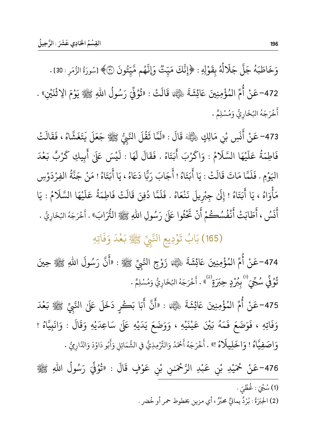 ٤٧٤ - عَنْ أُمِّ المُؤْمِنِينَ عَائِشَةَ - رضي الله عنها - زَوْجِ النَّبِيِّ - صلى الله عليه وسلم -: «أَنَّ رَسُولَ اللهِ - صلى الله عليه وسلم - حِينَ تُوُفِّي سُجِّيَ (¬١) بِبُرْدٍ حِبَرَةٍ (¬٢)». أَخْرَجَهُ البُخَارِيُّ وَمُسْلِمٌ.