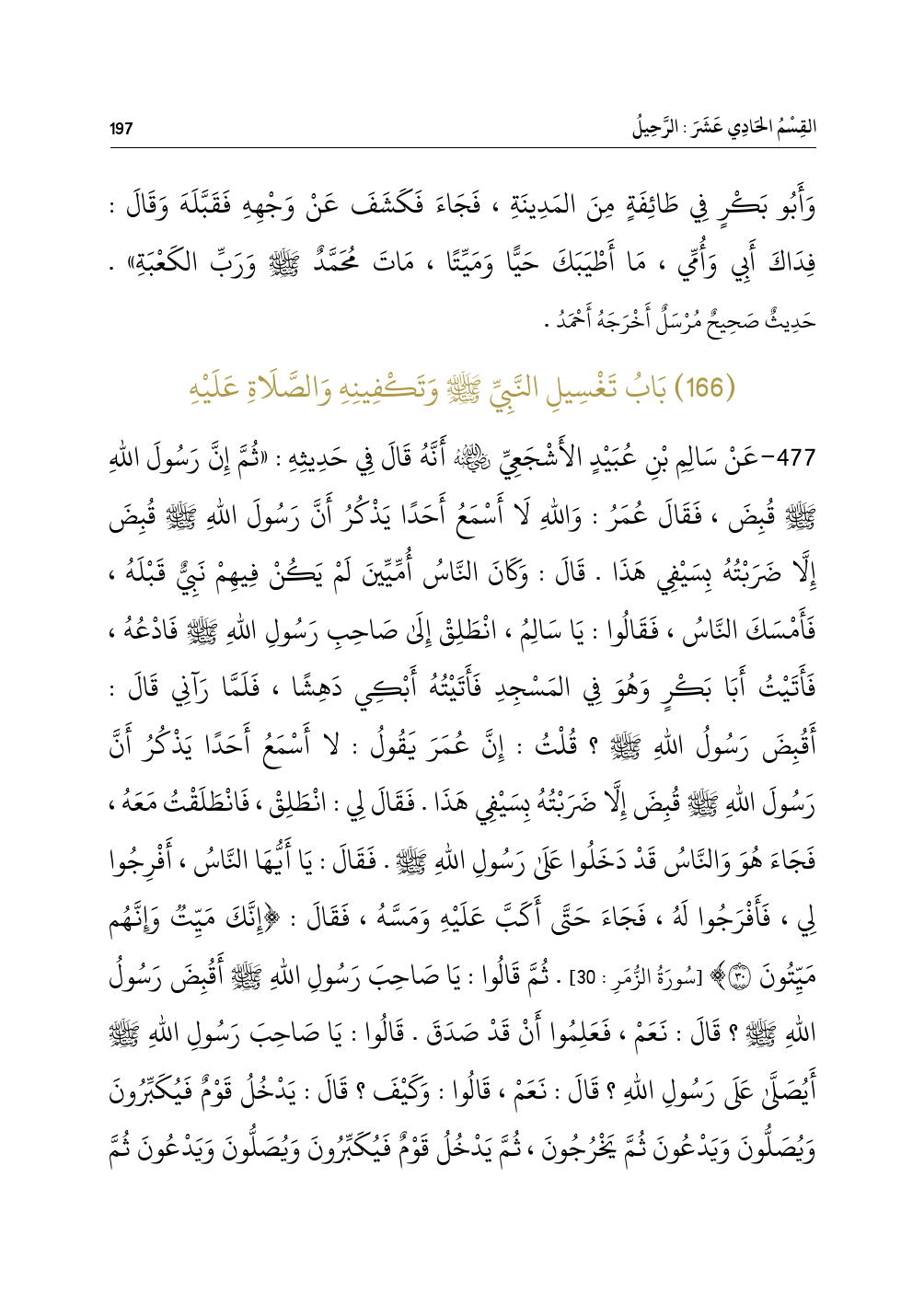 (١٦٦) بَابُ تَغْسِيلِ النَّبِيِّ - صلى الله عليه وسلم - وَتَكْفِينِهِ وَالصَّلَاةِ عَلَيْهِ