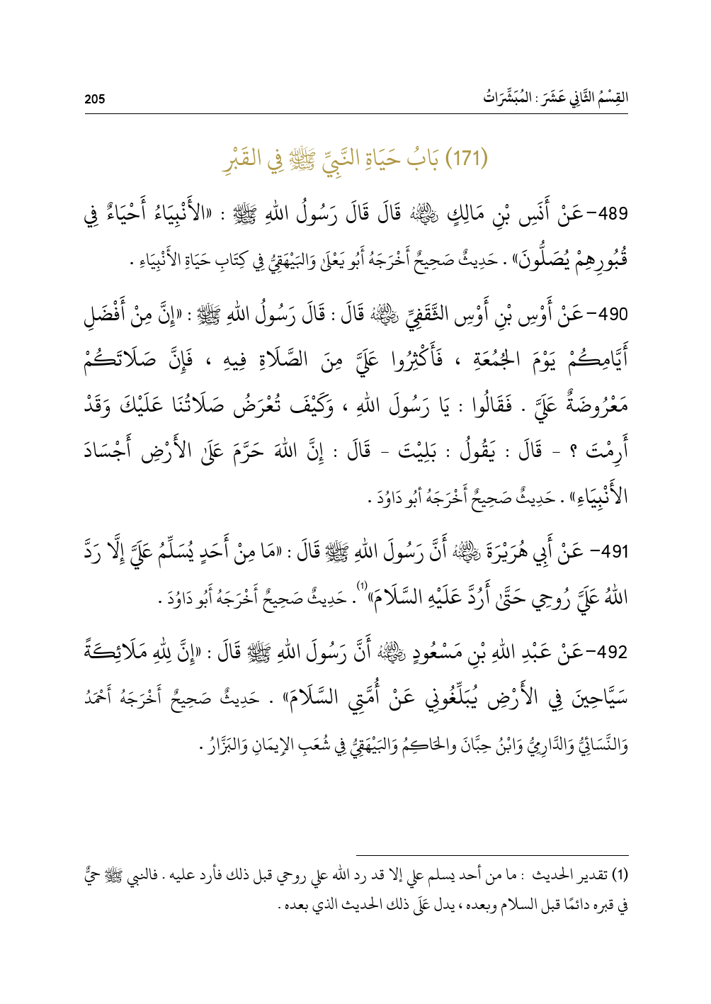 ٤٨٩ - عَنْ أَنَسِ بْنِ مَالِكٍ - رضي الله عنه - قَالَ قَالَ رَسُولُ اللهِ - صلى الله عليه وسلم -: «الأَنْبِيَاءُ أَحْيَاءٌ فِي قُبُورِهِمْ يُصَلُّونَ». حَدِيثٌ صَحِيحٌ أَخْرَجَهُ أَبُو يَعْلَى وَالبَيْهَقِيُّ فِي كِتَابِ حَيَاةِ الأَنْبِيَاءِ.