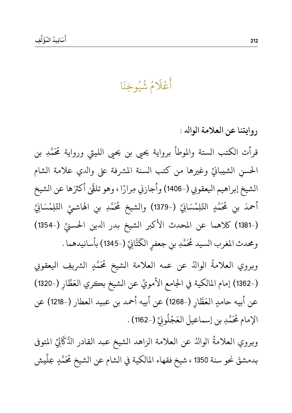 ويروي العلامةُ الوالدُ عن عمه العلامة الشيخ مُحَمَّدٍ الشريفِ اليعقوبي (-١٣٦٢) إمام المالكية في الجامع الأمويِّ عن الشيخ بكري العَطَّارِ (-١٣٢٠) عن أبيه حامدٍ العَطَّارِ (-١٢٦٨) عن أبيه أحمد بن عبيد العطار (-١٢١٨) عن الإمام مُحَمَّدِ بن إسماعيلَ العَجْلُونِيِّ (-١١٦٢).